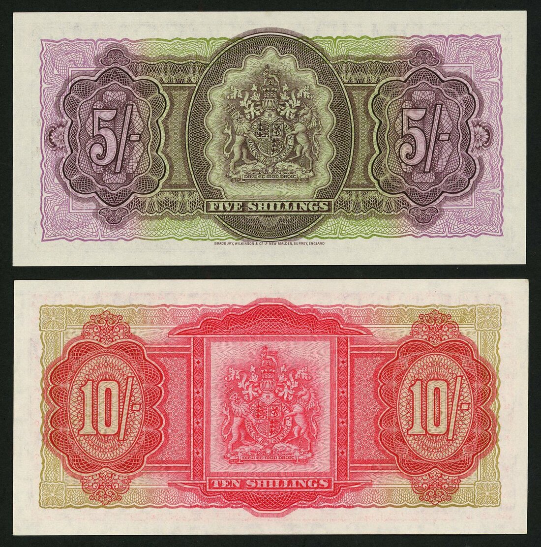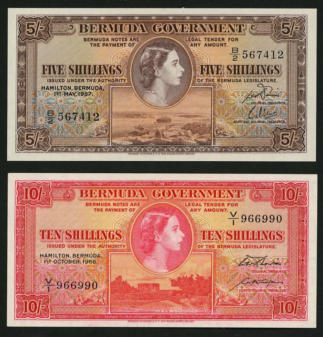 Bermuda Government, 5/-, 1957, 10/-, 1966, prefixes B/2, V/1, (Pick 18b, 19c, TBB B119b, B120c), uncirculated (2 notes)