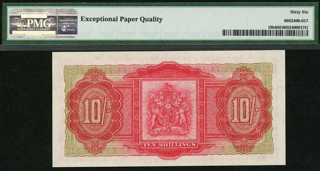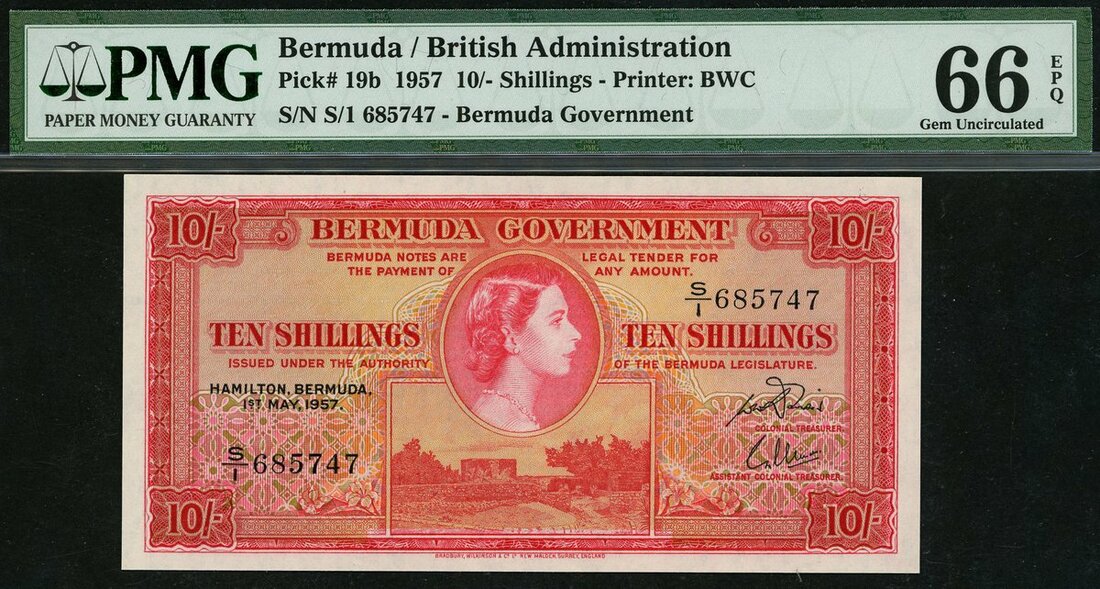 (x) Bermuda Government, 10 shillings, 1 May 1957, serial number S/1 685747, (Pick 19b, TBB B120b), in PMG holder 66 EPQ Gem Uncirculated