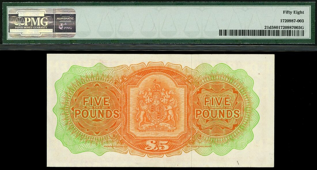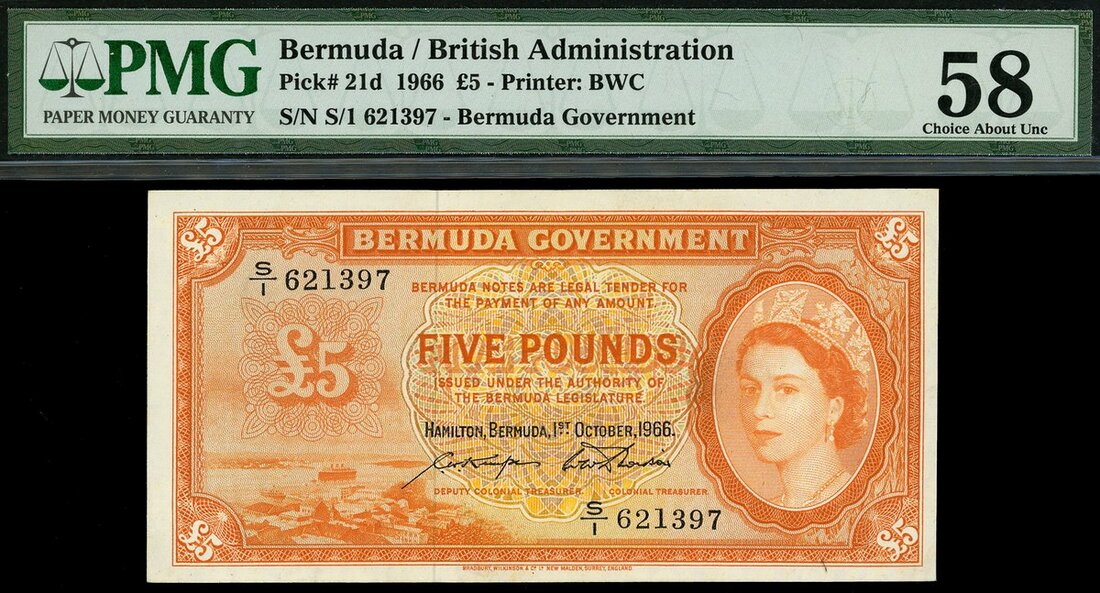 (x) Bermuda Government, £5, 1 October 1966, serial number S/1 621397, orange, Hamilton harbour at lower left, Queen Elizabeth II at right, signature Kempe and Davidson,