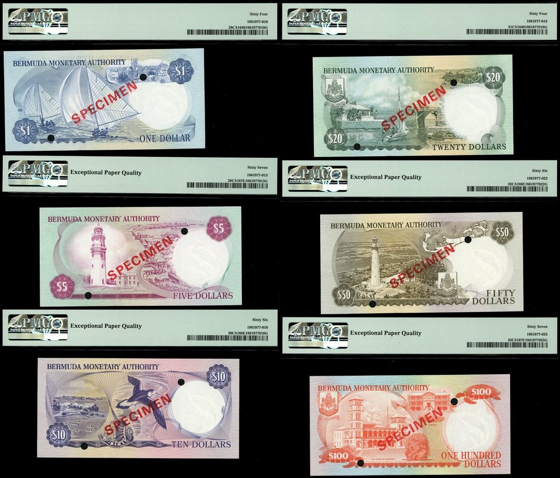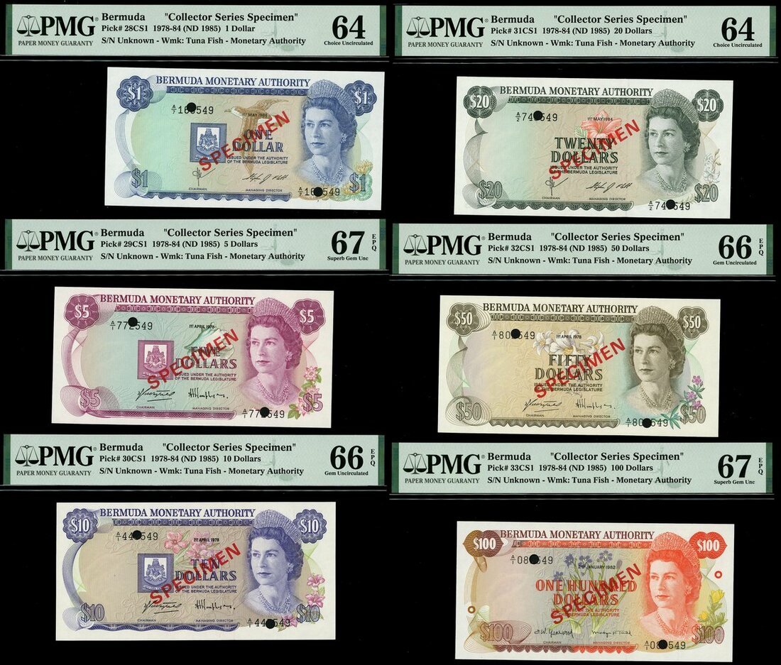 (x) Bermuda Monetary Authority, a set of specimen from 1985, including $1, $5, $10, $20, $50, (Pick 28CS1-33CS1), in PMG holders $1 and $5 64 Choice Uncirculated, $10 and $50 66 EPQ Gem Uncirculated, $5 and $100 67 EPQ Superb Gem Unc (6 notes)