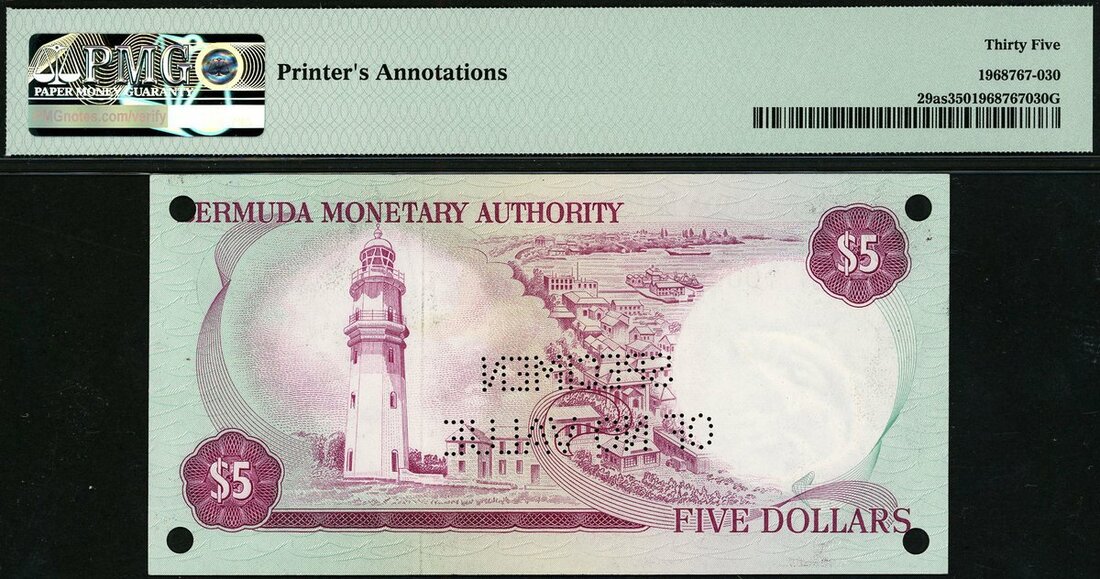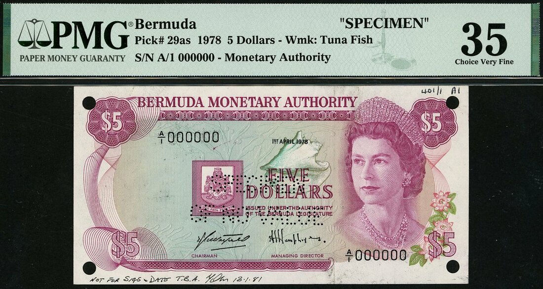 Bermuda Monetary Authority, specimen 5 dollars, 1978, (Pick 29as), in PMG holder 35 Choice Very Fine, printer's annotations,