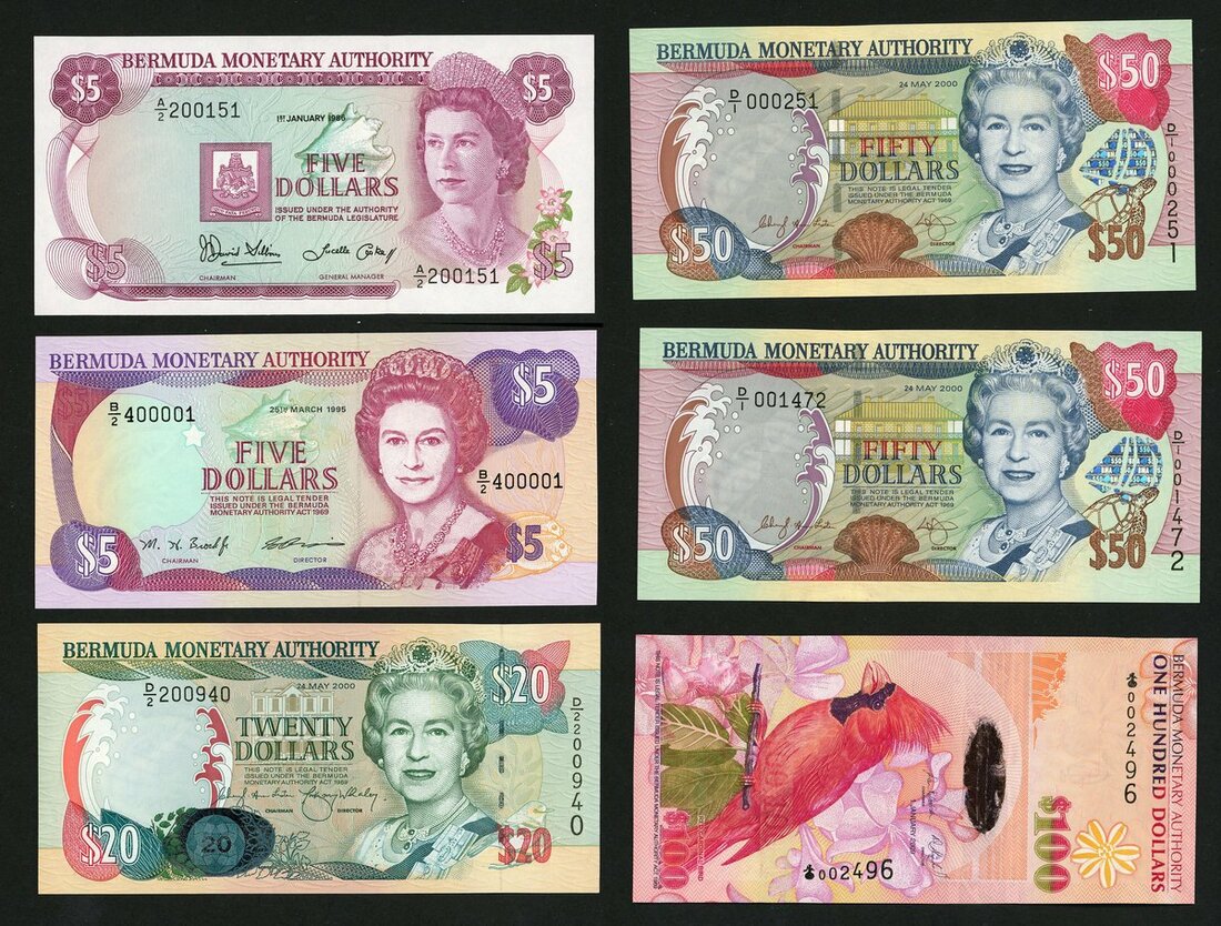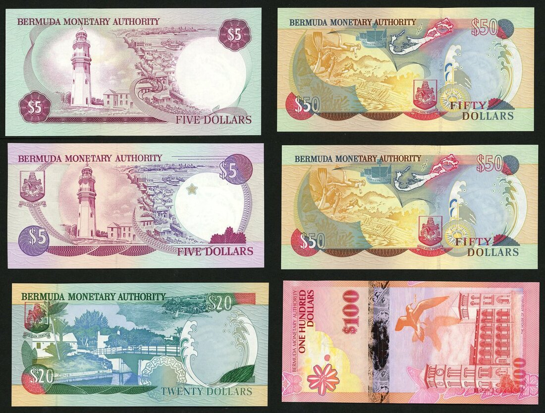 (x) Bermuda Monetary Authority, a group of interesting numbers, including $5 1986, $5 1995, $20 2000, $50 (2) 2000, $100 2009,