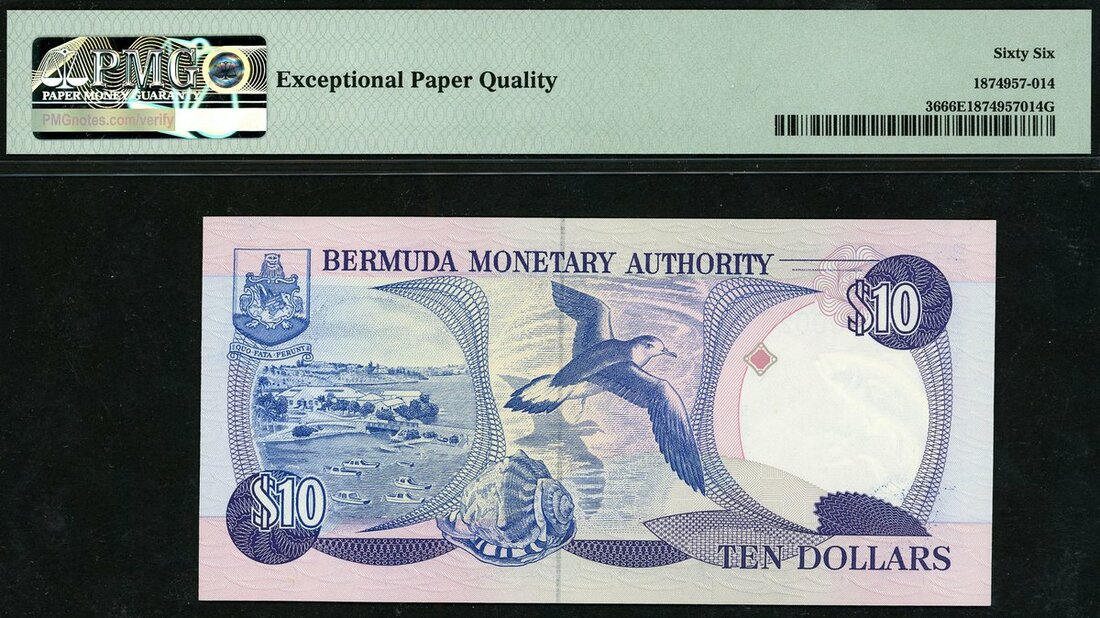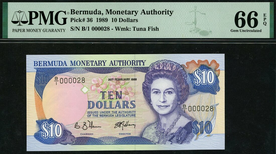 (x) Bermuda Monetary Authority, $20, 20 February 1989, serial number B/1 000028, (Pick 36, TBB B210), very low number, in PMG holder 66 EPQ Gem Uncirculated
