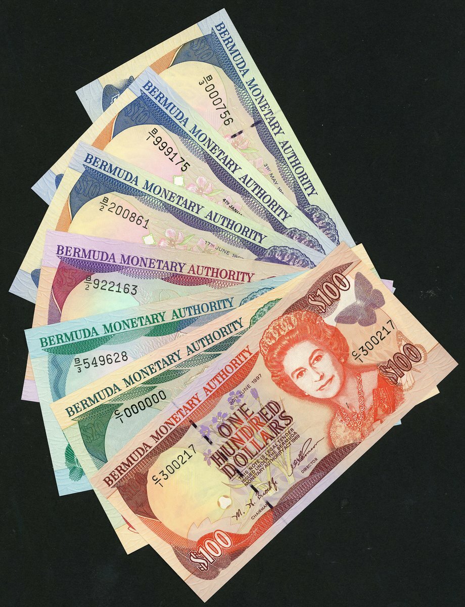 Bermuda Monetary Authority, $10, 1993, $2, 5, 10, 1997, $10, 1999, specimen $20, commemorative issue, 1997 and a $100, 1997, red, Brock and Thomson signatures