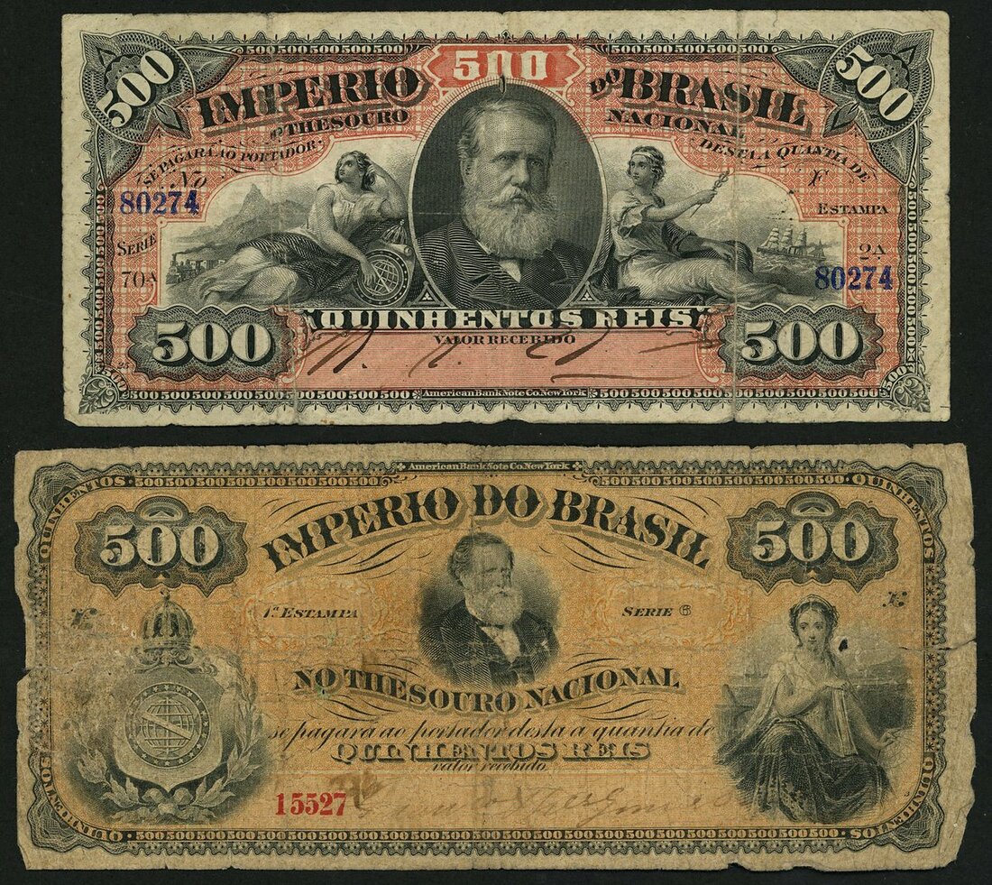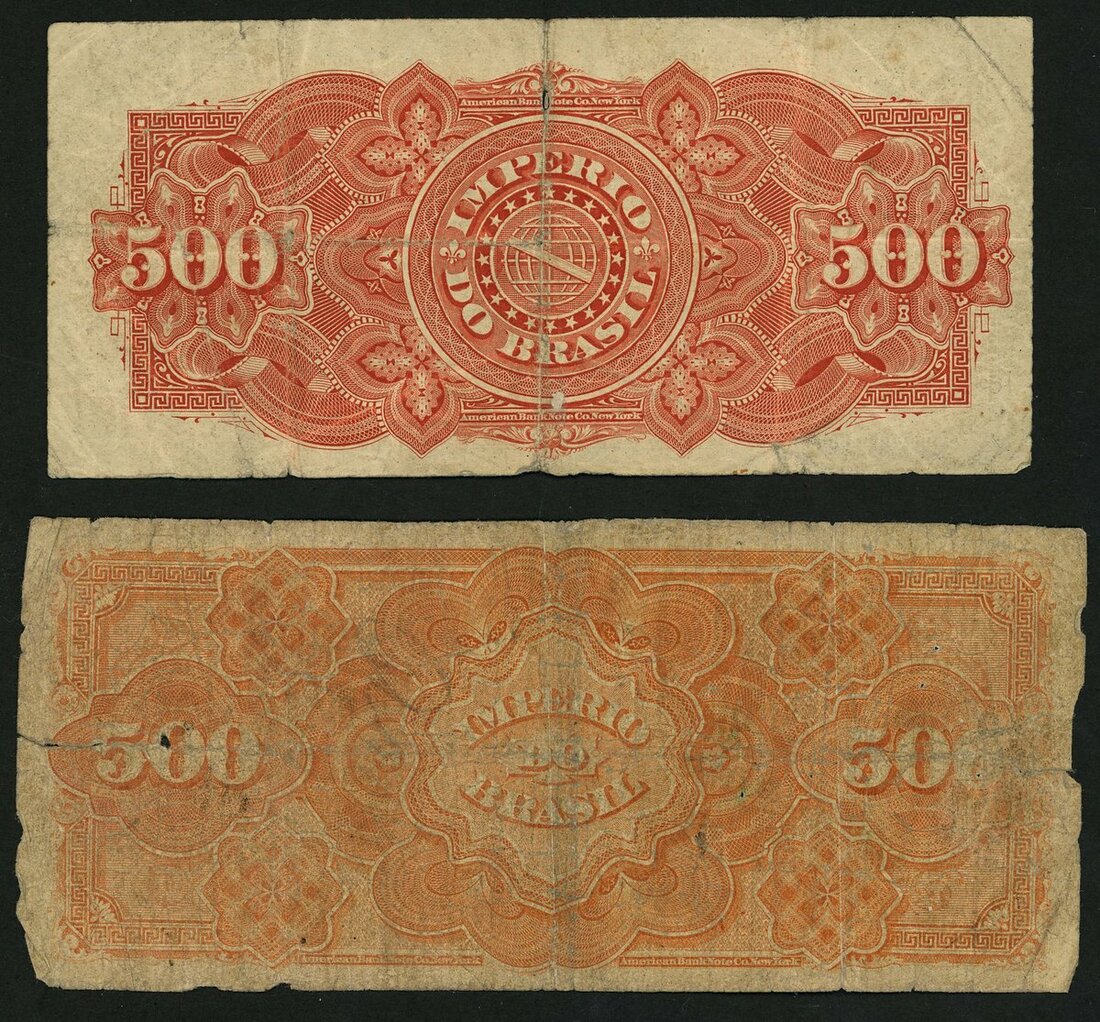 Imperio do Brasil, 500 mil reis, ND (1874), pale orange-brown, Dom Pedro II at centre, arms at left, maiden at right, also 500 reis, ND (1885), pink and grey, Dom Pedro II at centre flanked by maidens