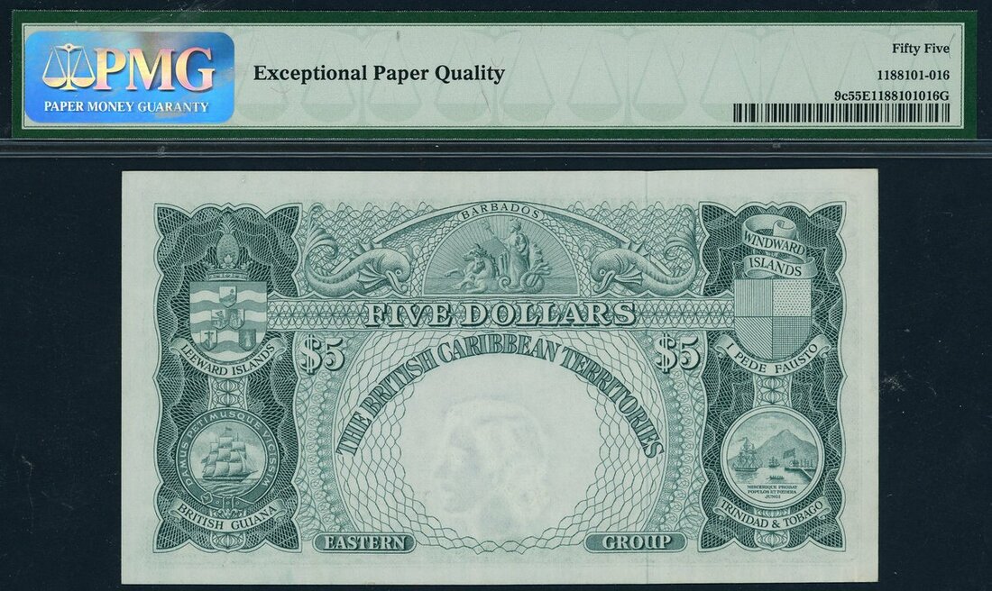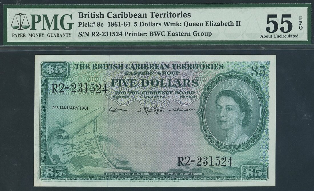 British Caribbean Territories, Currency Board, $5, 2 January 1961, serial number R2-231524, green on multicoloured underprint, portrait of Queen Elizabeth II in oval at upper right, map scroll at lower left, reverse Queen on biga drawn by hippocamp at top centre, coats of arms at left and right,