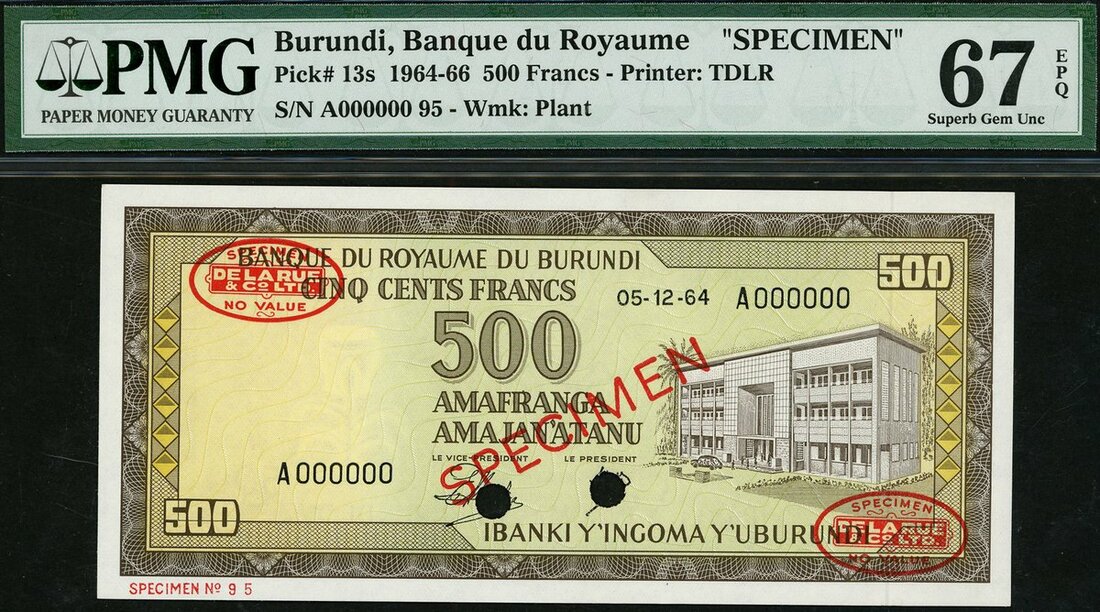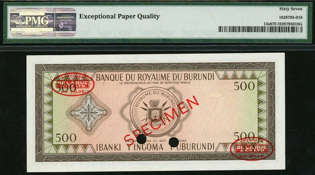 Banque de la Republique du Burundi, specimen 500 francs, 5 December 1964, (Pick 13s), PMG Top Pop, 67EPQ Gem Uncirculated