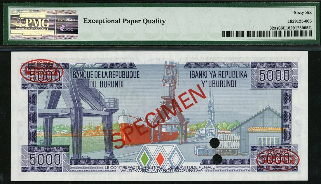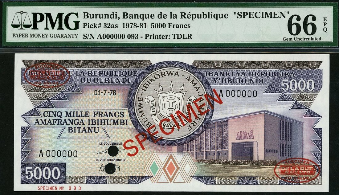 Banque de la Republique du Burundi, specimen 5000 francs, 1 July 1978, (Pick 32as), PMG Top Pop, 66EPQ Gem Uncirculated