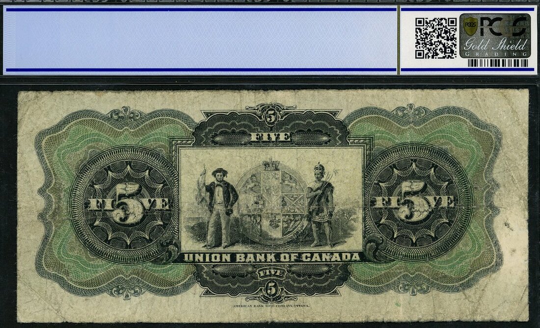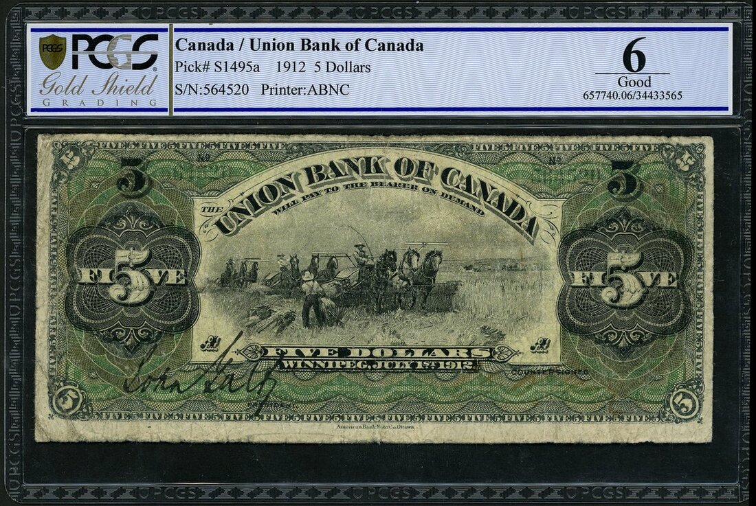 (x) Union Bank of Canada, $5, 1 July 1912, serial number 564520, (Pick S1495a, Charlton 730-16-04a), in PCGS holder 6 Good, scarce in any grade