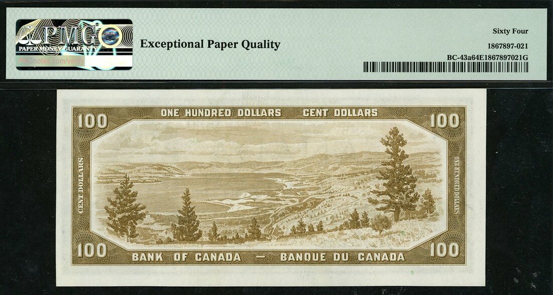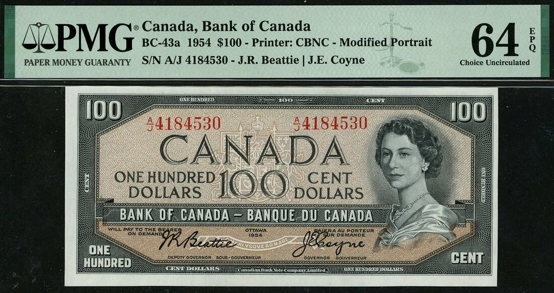 (x) Bank of Canada, $100, 1954, serial number A/J 4184530, (Pick 82a, Charlton BC-43a), in PMG holder 64 EPQ Choice Uncirculated