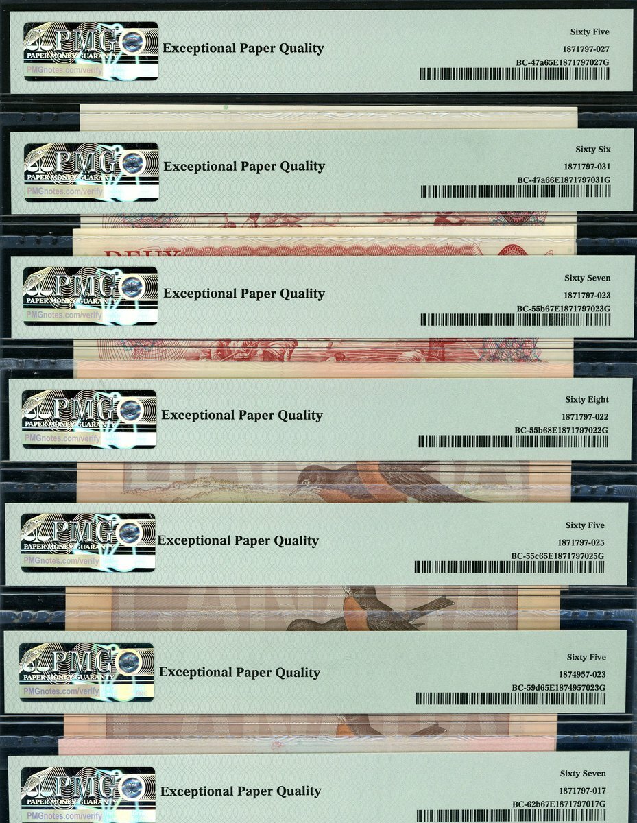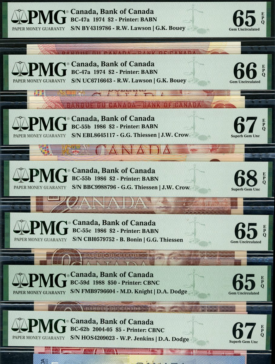 (x) Bank of Canada, $2 (5), 1974, 1986, $50, 1988, $5, 2004-05, (Charlton BC-47a, 55b, c, 59d, 62b), in PMG holders 65-68 EPQ (7 notes)