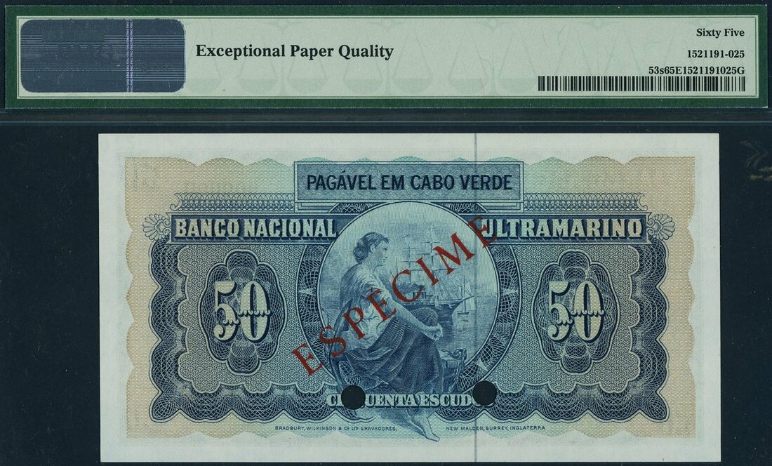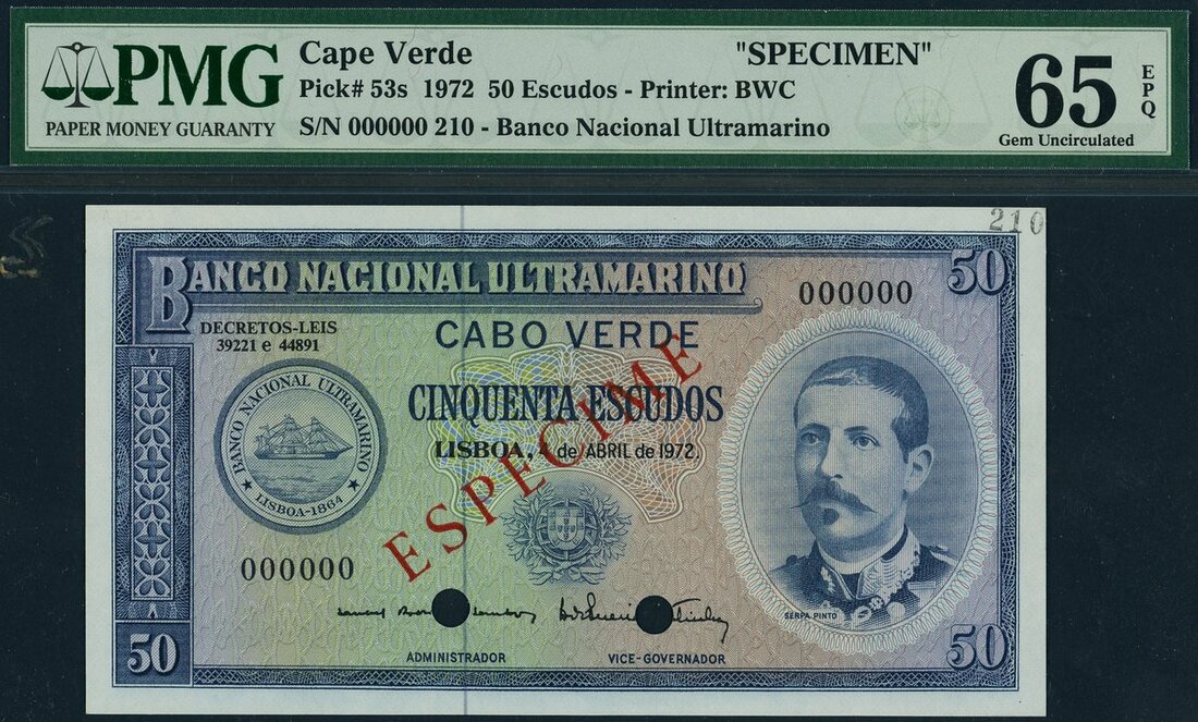 (x) Cape Verde, Banco Nacional Ultramarino, Specimen 50 escudos, 4th April 1972, serial number 000000 210, (Pick 53s), in PMG holder 65 EPQ Gem Uncirculated only 2 on PMG population report with this Specimen being the highest grade and the only to have EPQ, scarce