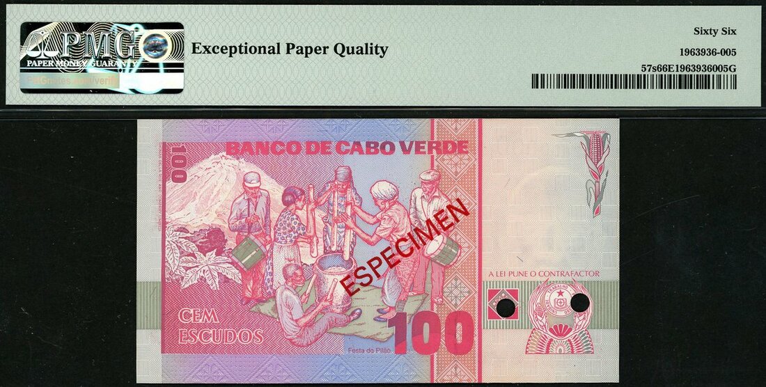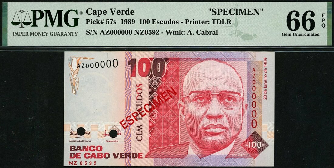 (x) Banco de Cabo Verde, specimen 100 escudos, 1989, serial number AZ 000000, red, Cabral at right