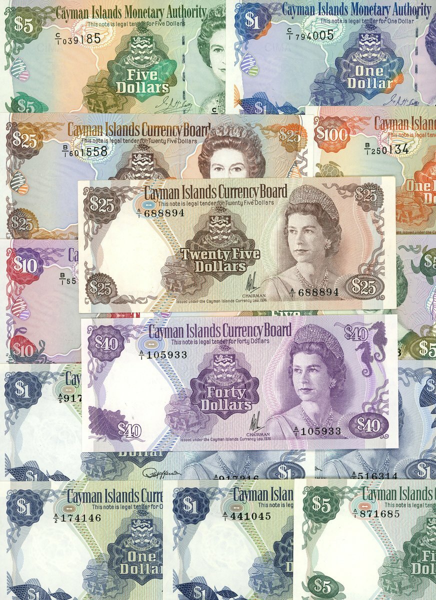 Cayman Islands Currency Board, $1 (4), 1971/1974, blue, $5, green, $25, brown, $40, violet, $5, 1991, serial number B/1 000113, also $1, 5, 10, 25 and $100, law of 1996, McCarthy signature