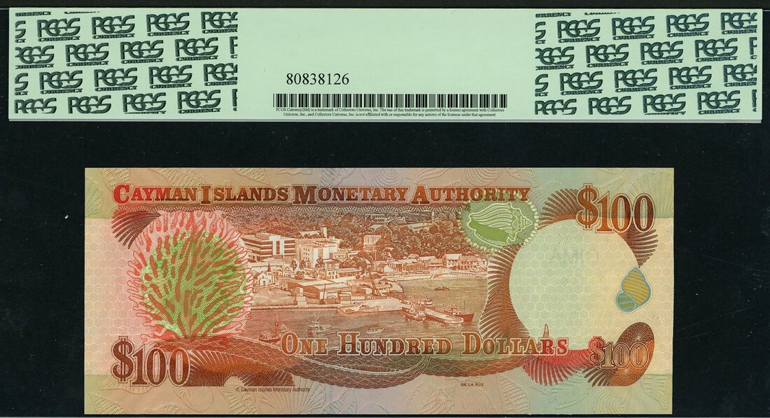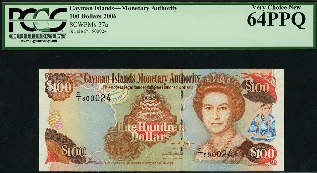 Cayman Islands Currency Board, $100, ND (2006), serial number C/1 000024, orange-brown, red and pale blue, Elizabeth II at right, arms at centre, Jefferson signature