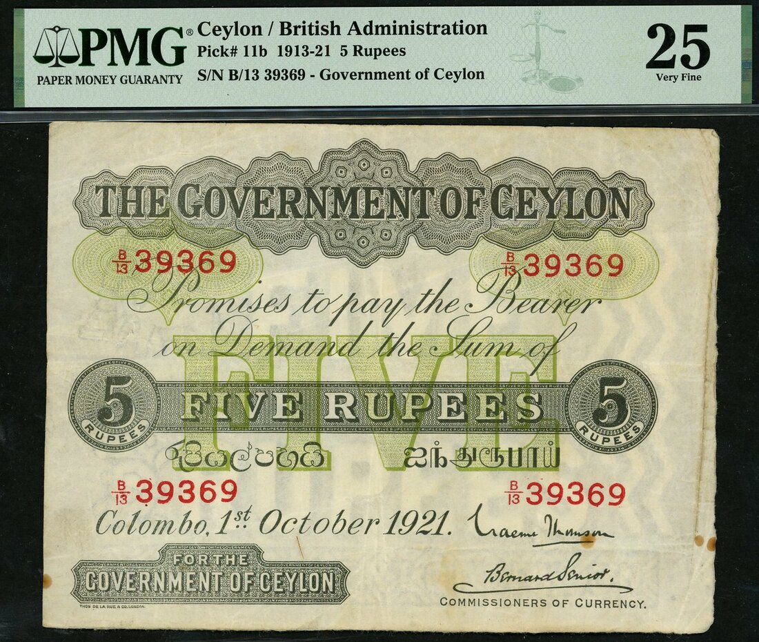 Government of Ceylon, 5 rupees, 1 October 1921, red serial number B/13 39369, black and white with value in pale green at centre, Thomson and Senior signatures