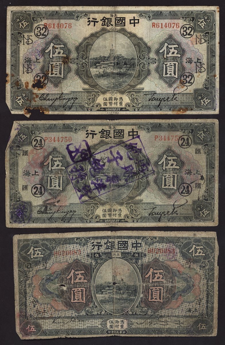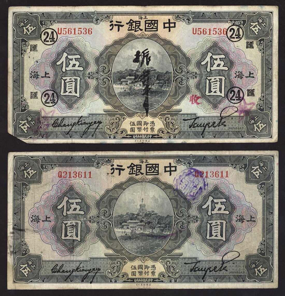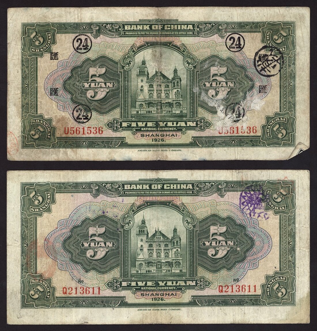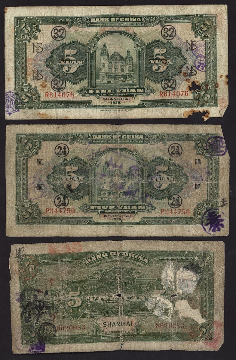 Bank of China, 5 yuan (4), Shanghai, 1926, also a 5 yuan, 1918,