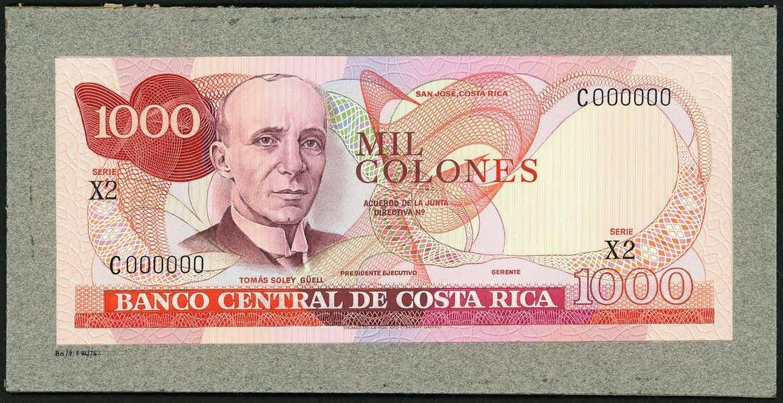Banco Central de Costa Rica, a printer's obverse composite essay on card for a 1000 colones, ND (1974), prefix C, red on multicolour underprint, Guell at left,