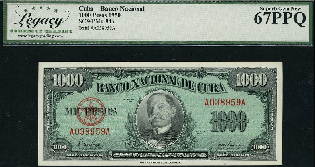 (x) Banco Nacional de Cuba, 1000 pesos, 1950, red prefix A, dark grey and blue-green, Palma at centre