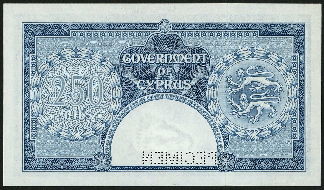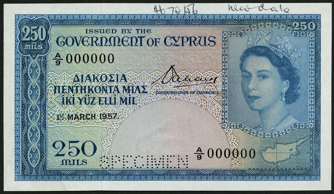 Government of Cyprus, printer's archival specimen 250 Mils, 1 March 1957, serial number A/9 000000, blue and lilac, portrait of Queen Elizabeth II at right, reverse arms at right, value in decorated circle at left