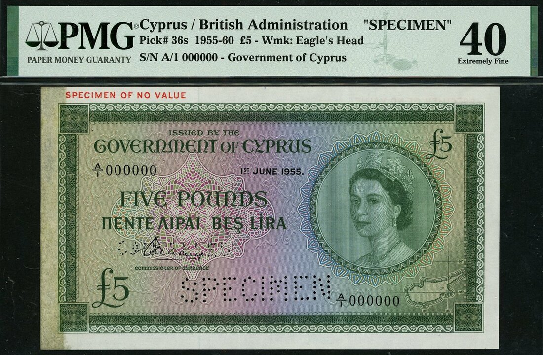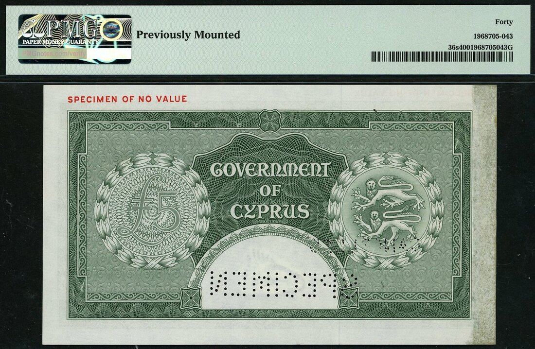 (x) Government of Cyprus, specimen £5, 1 June 1955, (Pick 36s), in PMG holder 40 Extremely Fine, previously mounted