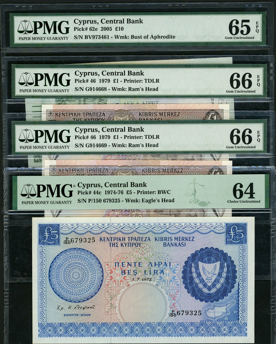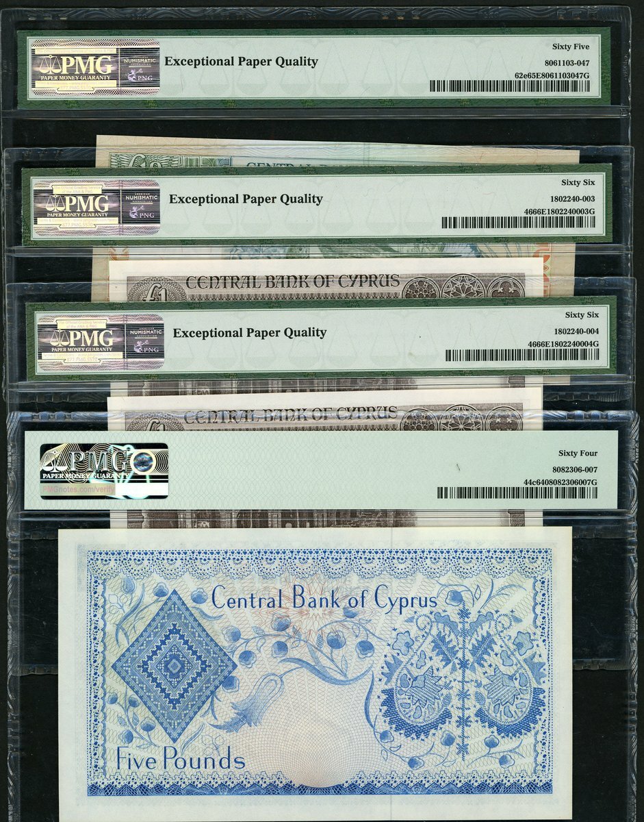 (x) Central Bank of Cyprus, £1 (2), £5, £10, 1974-2005), (Pick 46, 44c, 62e), in PMG holders, 66EPQ, 66EPQ, 64Choice Unc, 65EPQ (4 notes)