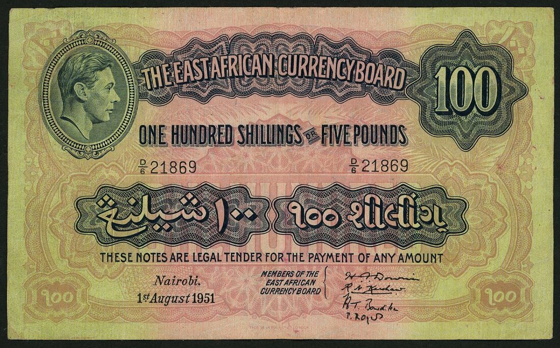 East African Currency Board, 100 shillings, 1 August 1951, serial number D/6 21869, (Pick 31b, TBB B220h), about very fine