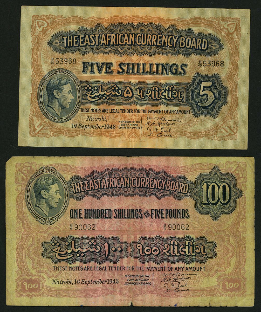 East African Currency Board, 100 shillings, 1 September 1943, serial number B/9 90062, also 5 shillings, 1 September 1943,