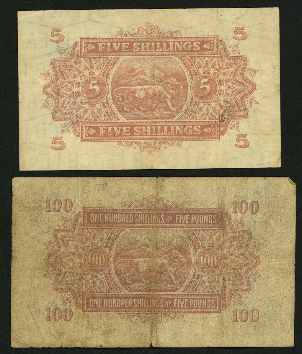 (Pick 31b, 28b, TBB B220d, B217f), 100 shillings fine, 5 shillings very fine (2 notes)