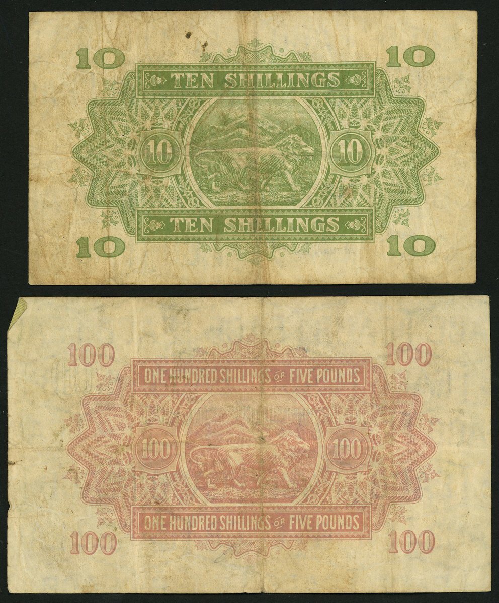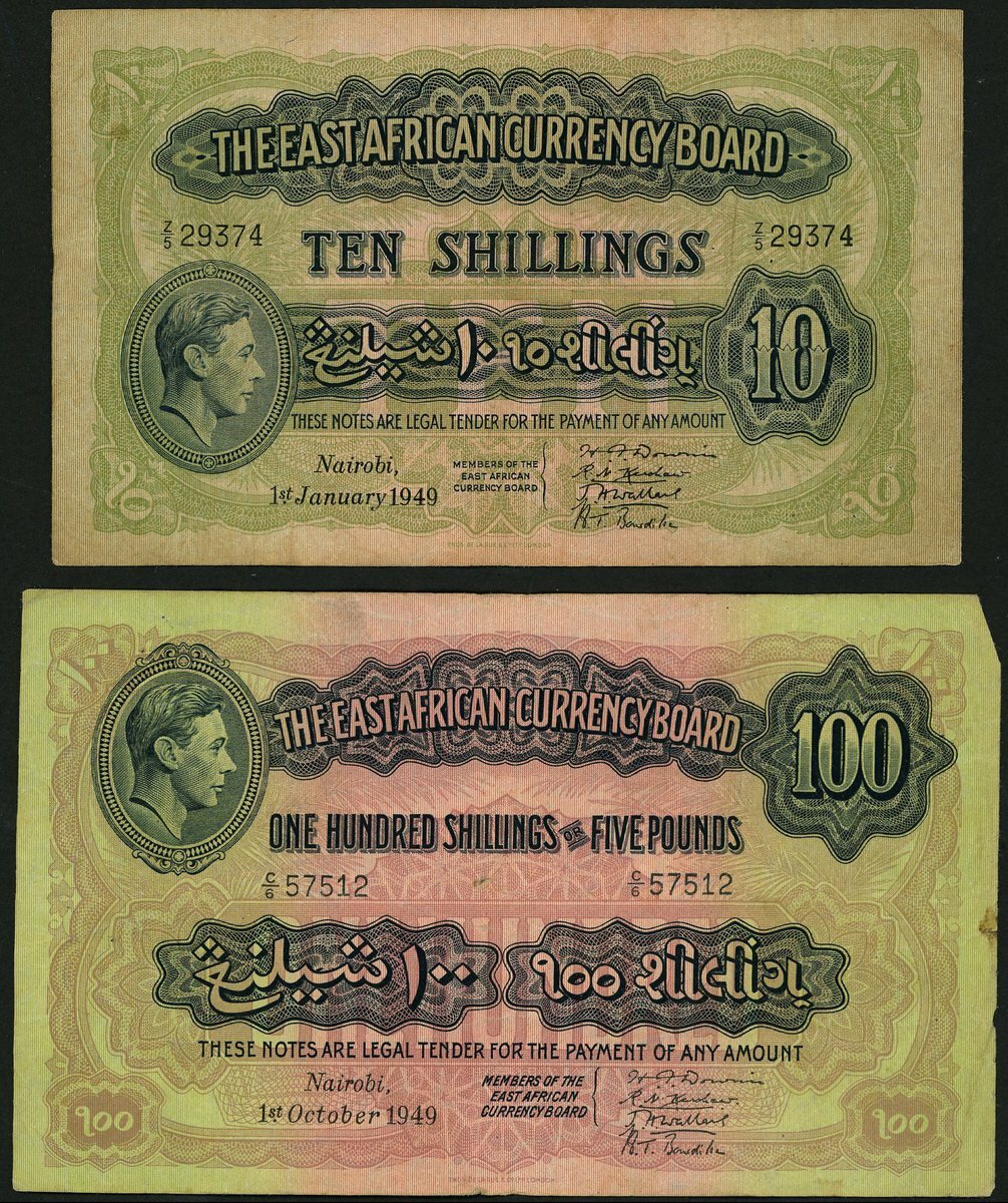 East African Currency Board, 100 shillings, 1 October 1949, serial number C/6 51512, also a 10 shillings, 1 January 1949,