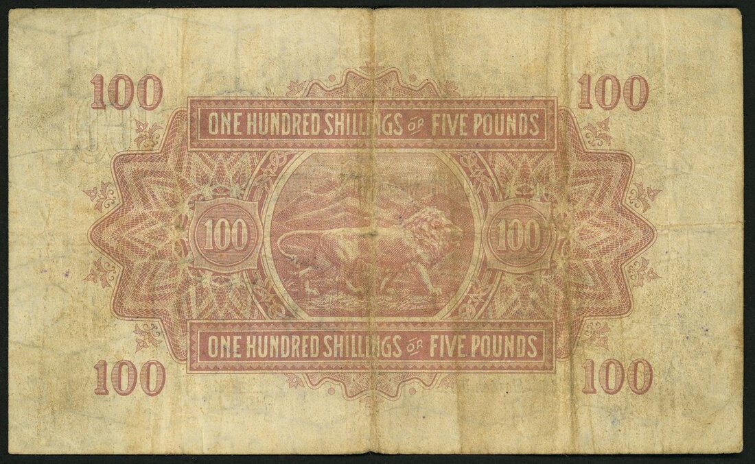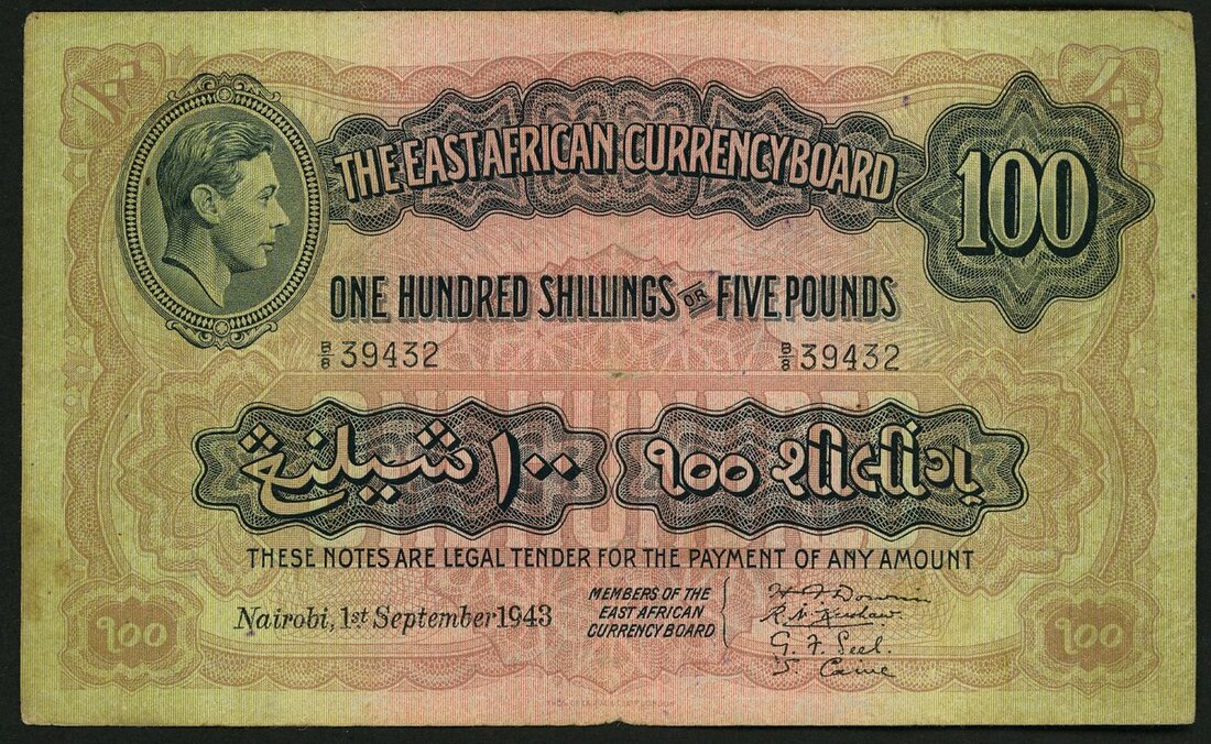 East African Currency Board, 100 shillings, 1 September 1943, serial number B/8 39432, (Pick 31b, TBB B220d), centre hold from folding, fine
