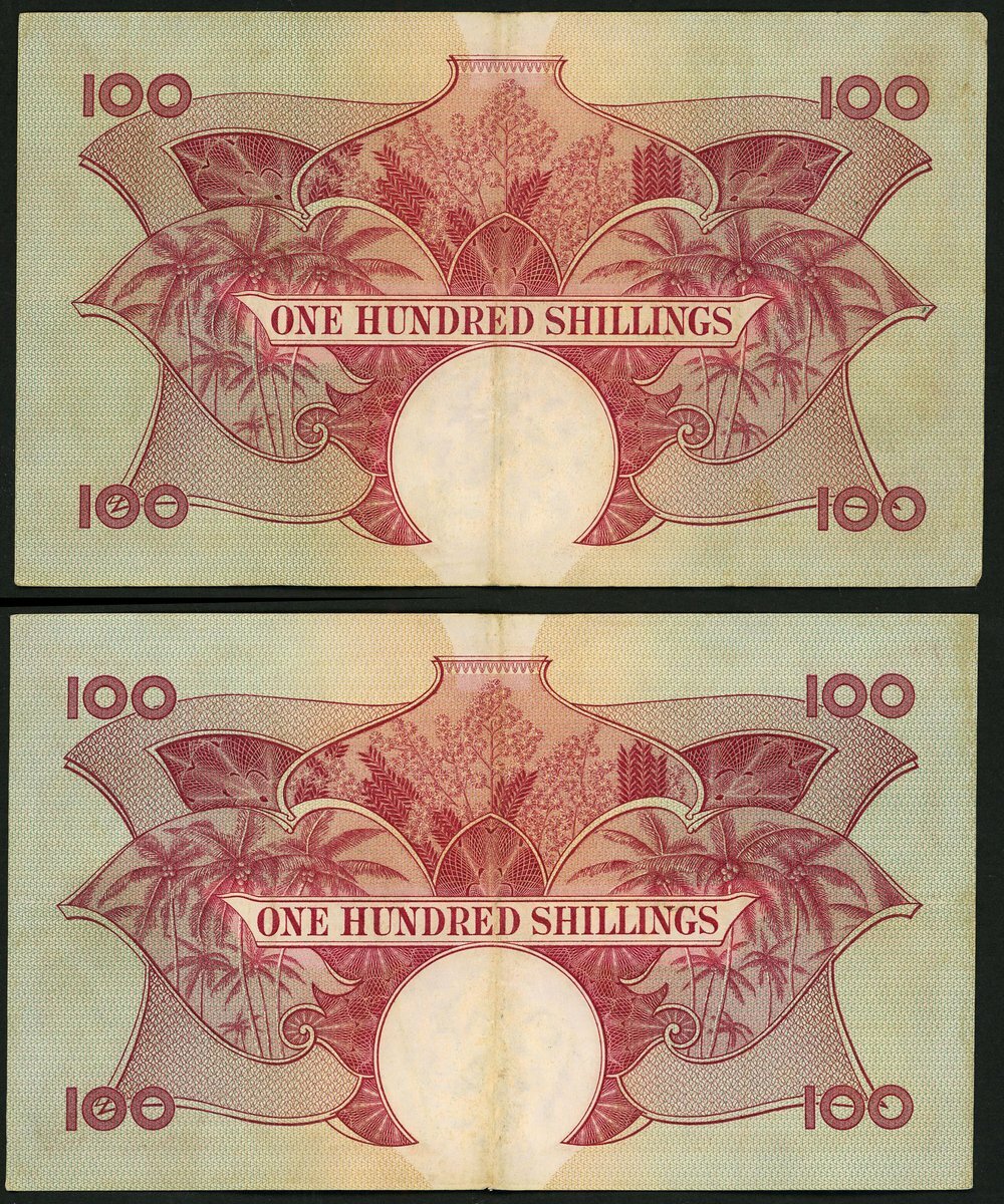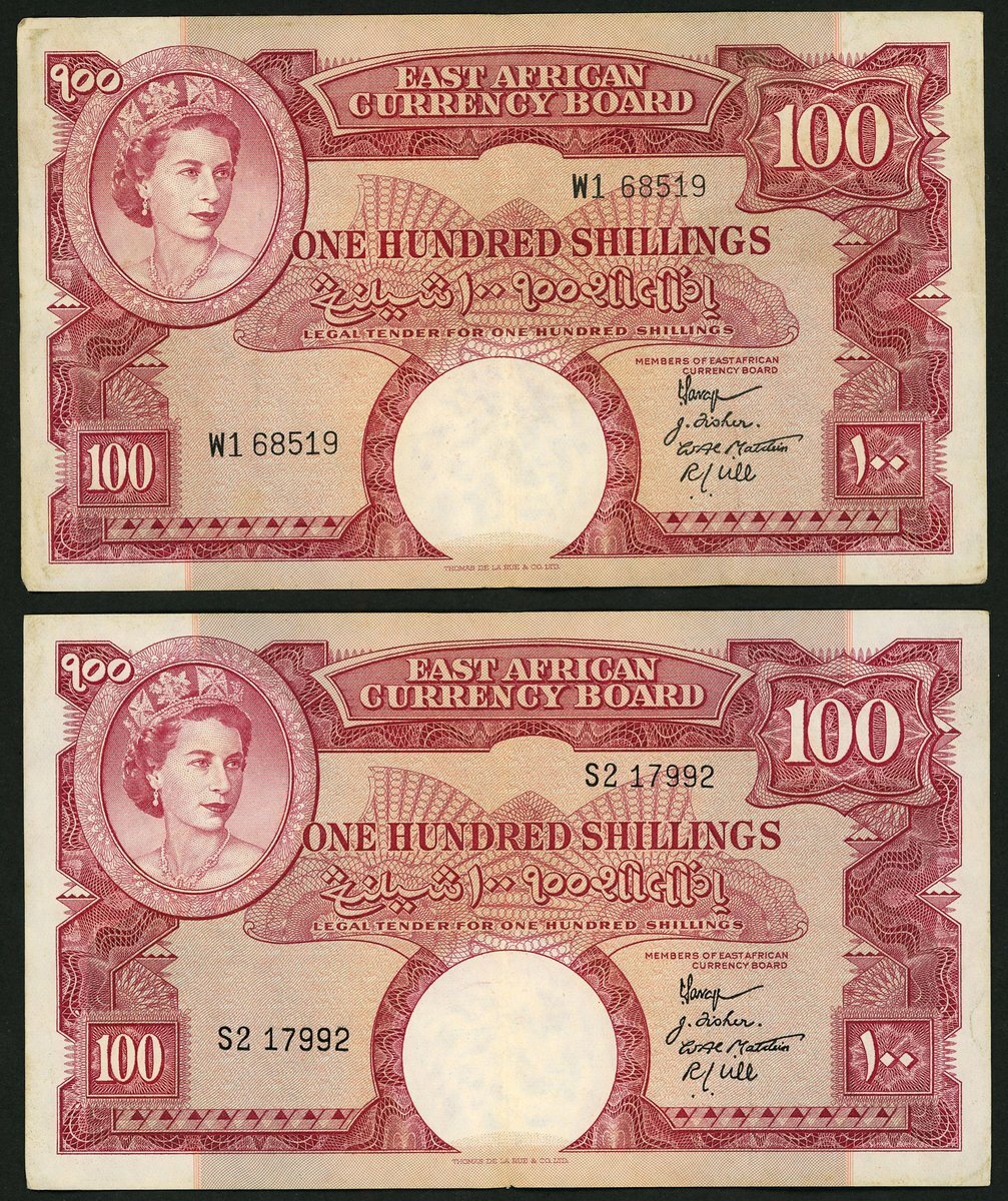 East African Currency Board, 100 shillings, Nairobi, ND (1958-60), prefix S2, W1, (Pick 40a, TBB B230a), S2 good very fine, W1 very fine (2 notes)