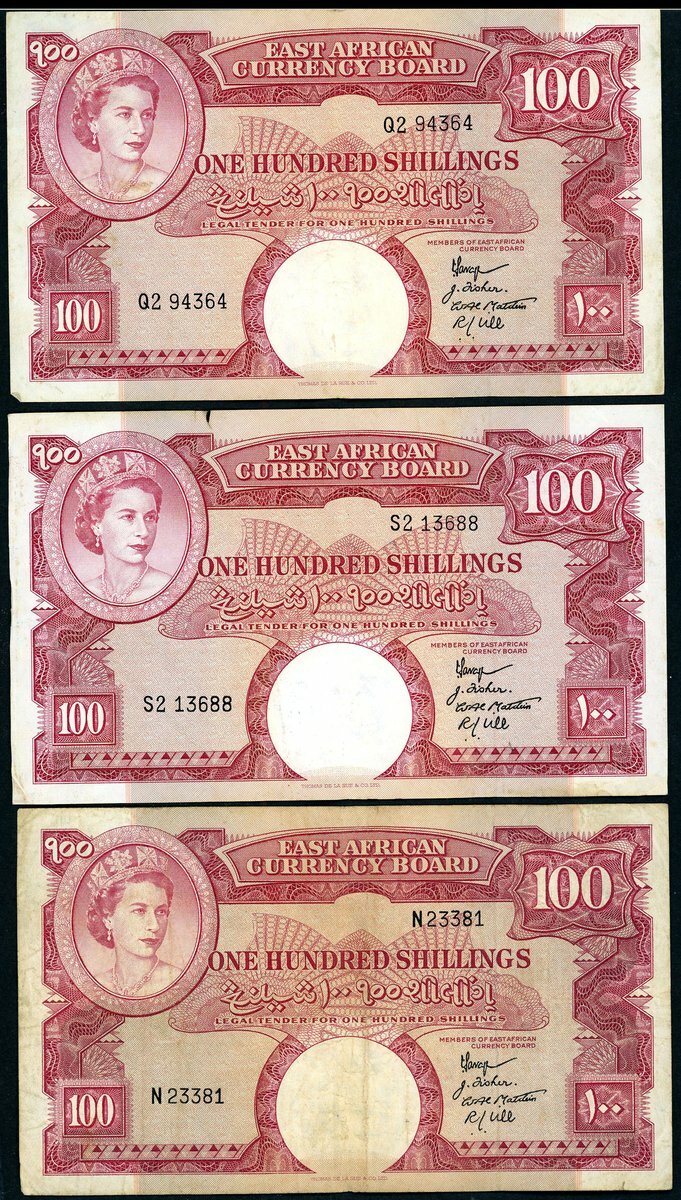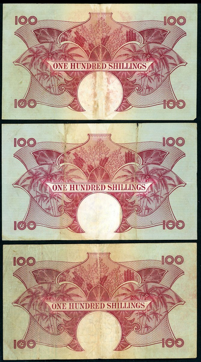 East African Currency Board, 100 shillings, Nairobi, ND (1958-60), prefix N, Q2, S2, (Pick 40a, TBB B230a), prefix N good fine, S2 split at upper left margin otherwise very fine, Q2 very fine (3 notes)