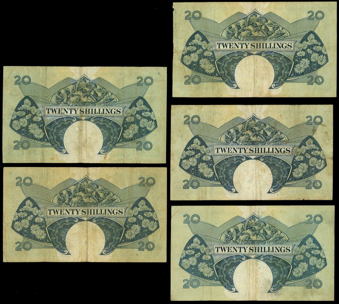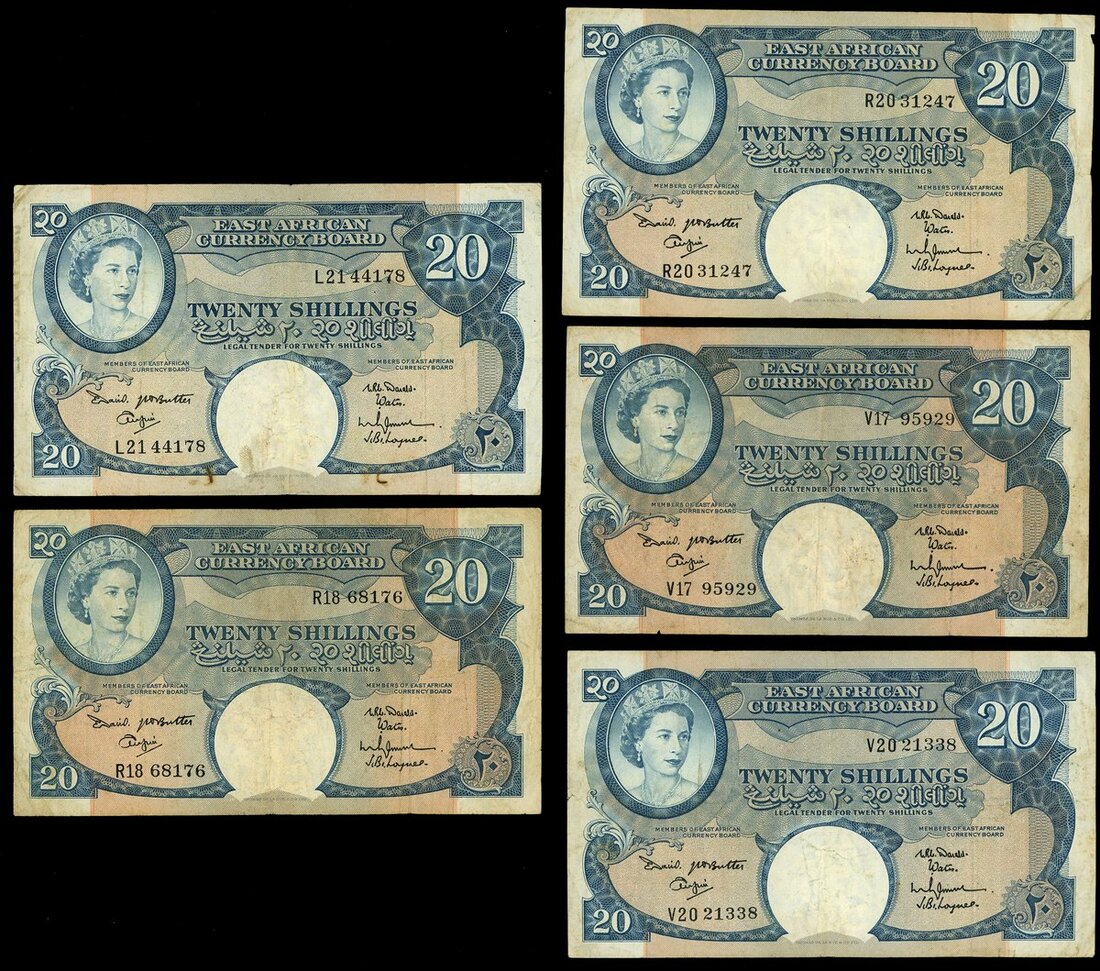 East African Currency Board, 20 shillings, Nairobi, ND (1961-63), prefix L21, R18, R20, V17, V20, (Pick 43a, TBB B229b), about very fine to very fine (5 notes)