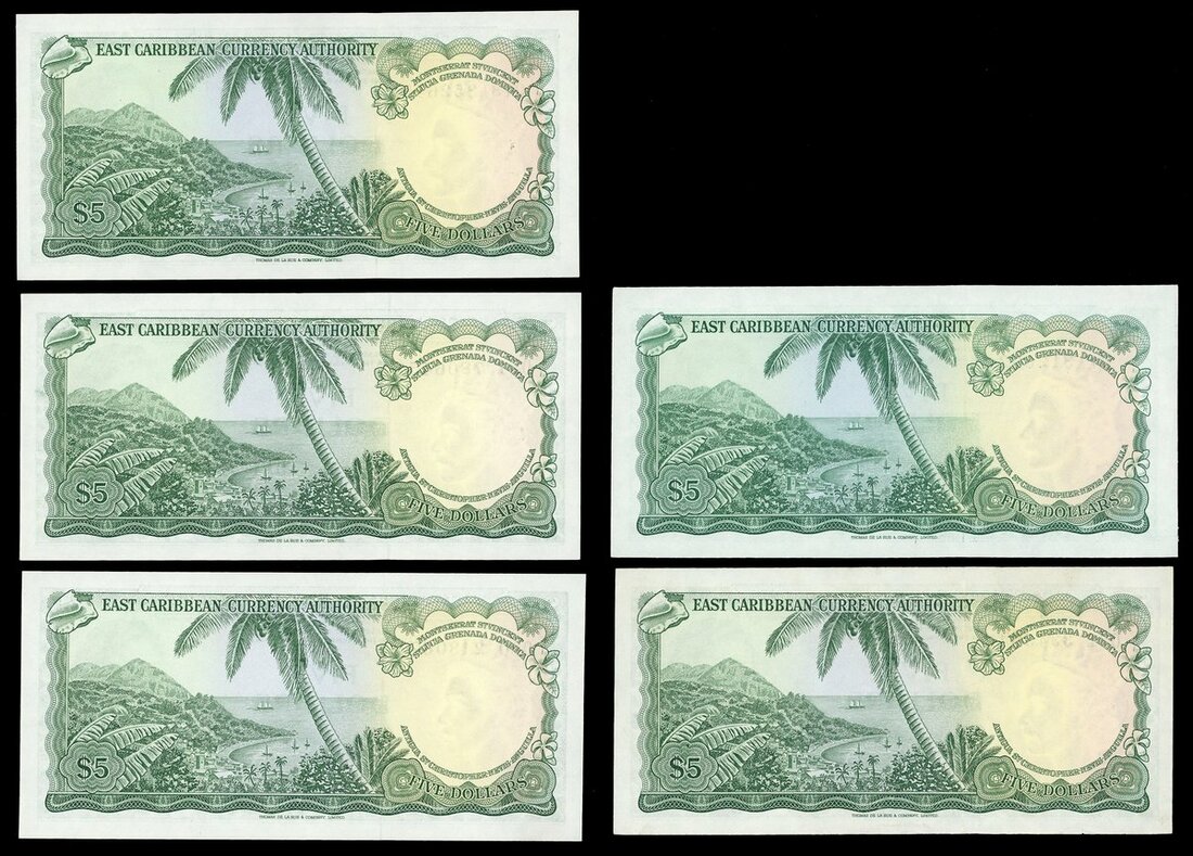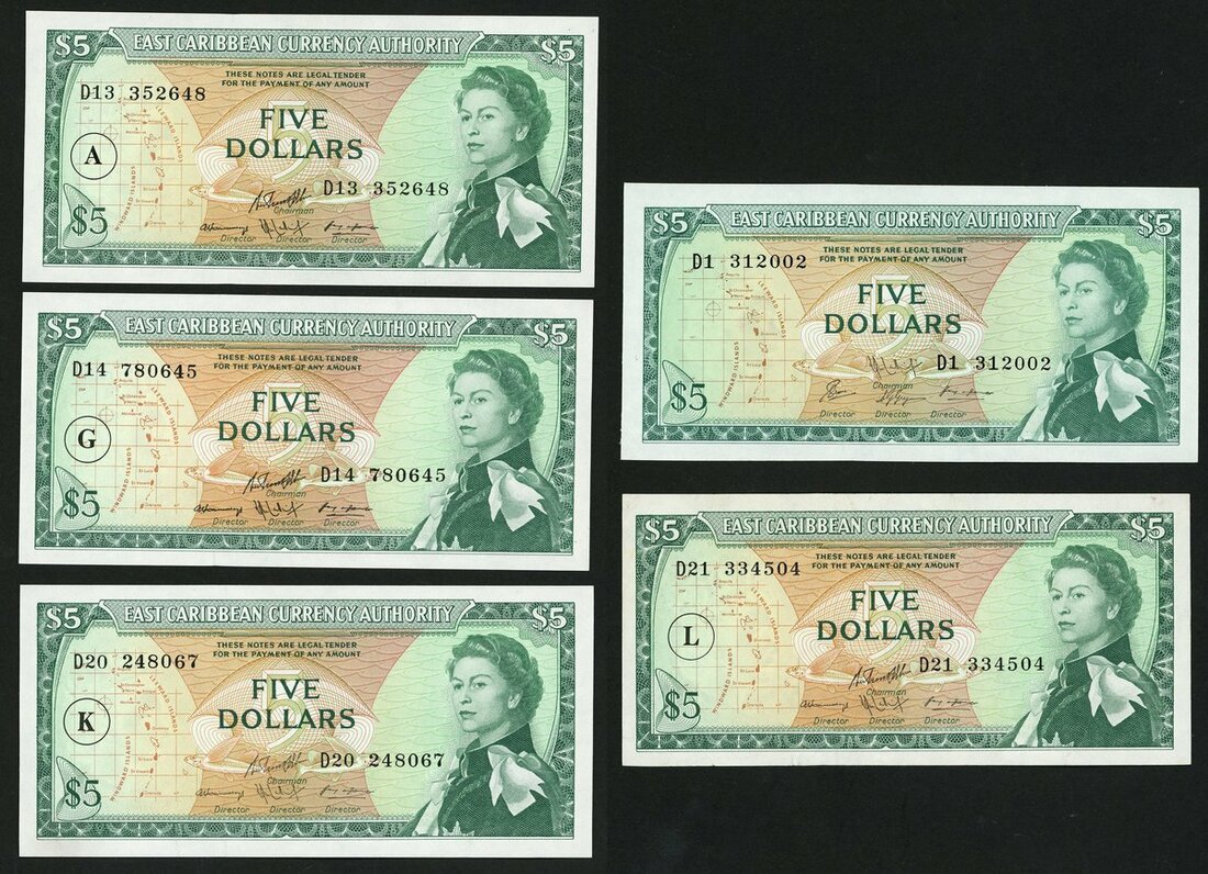 East Caribbean Currency Authority, $5 (5), ND (1965-83), including Antigua and Barbuda, Grenada, Saint Kitts and Nevis, Saint Lucia,