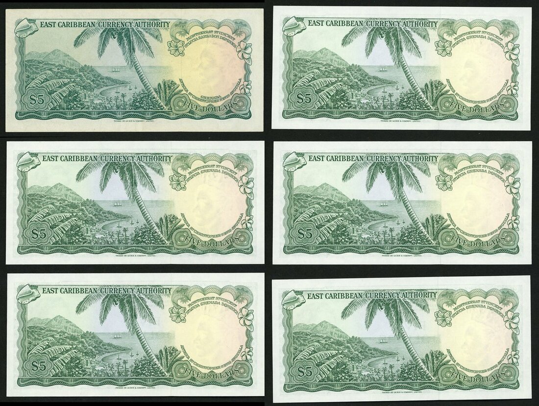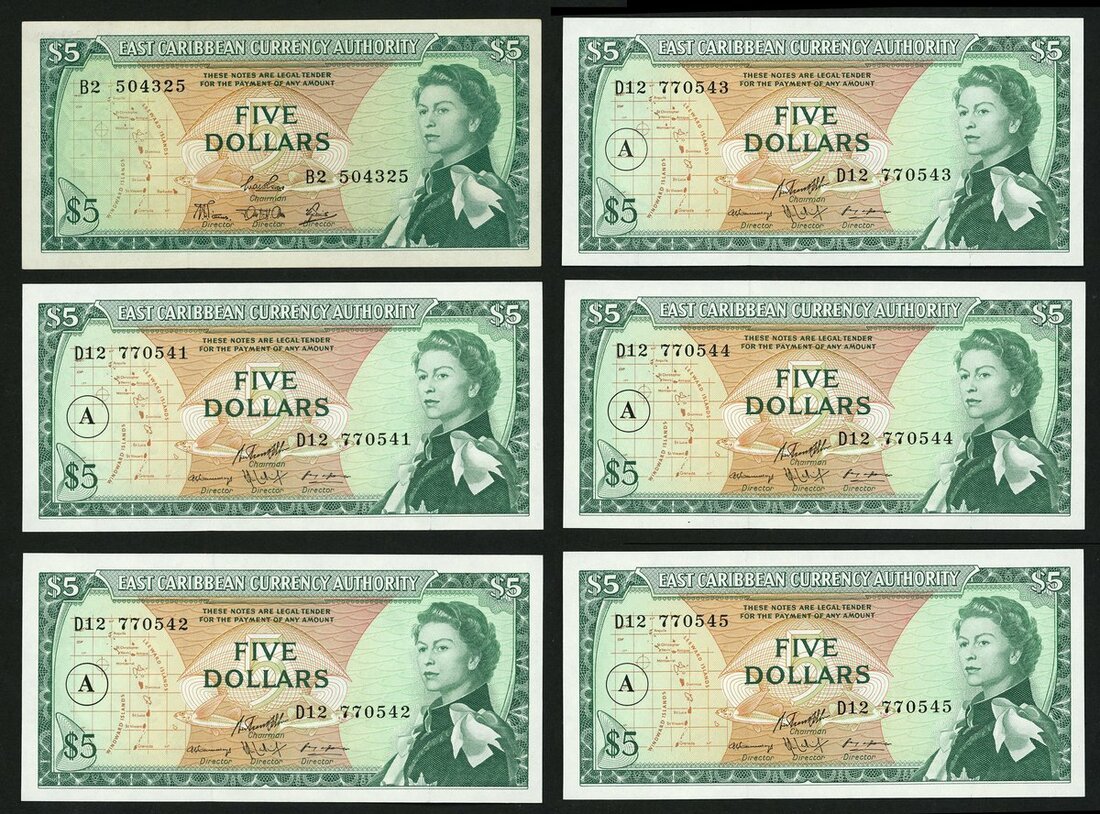 (x) East Caribbean Currency Authority, $5, ND (1965), serial number B2 504325, also a consecutive run of $5 (5), Antigua and Barbuda, prefix D12