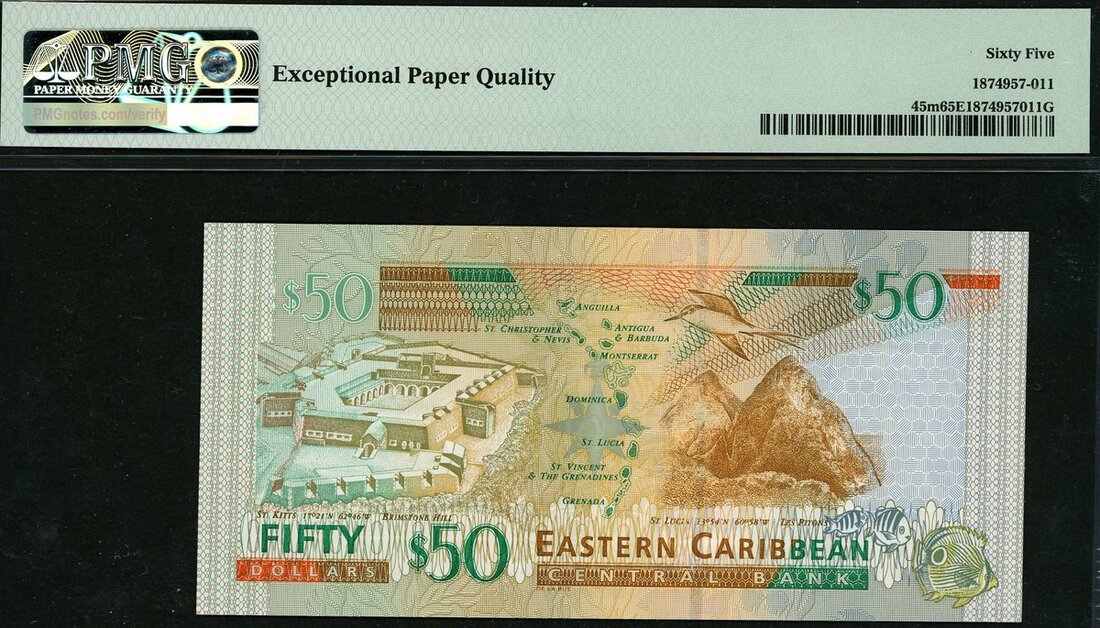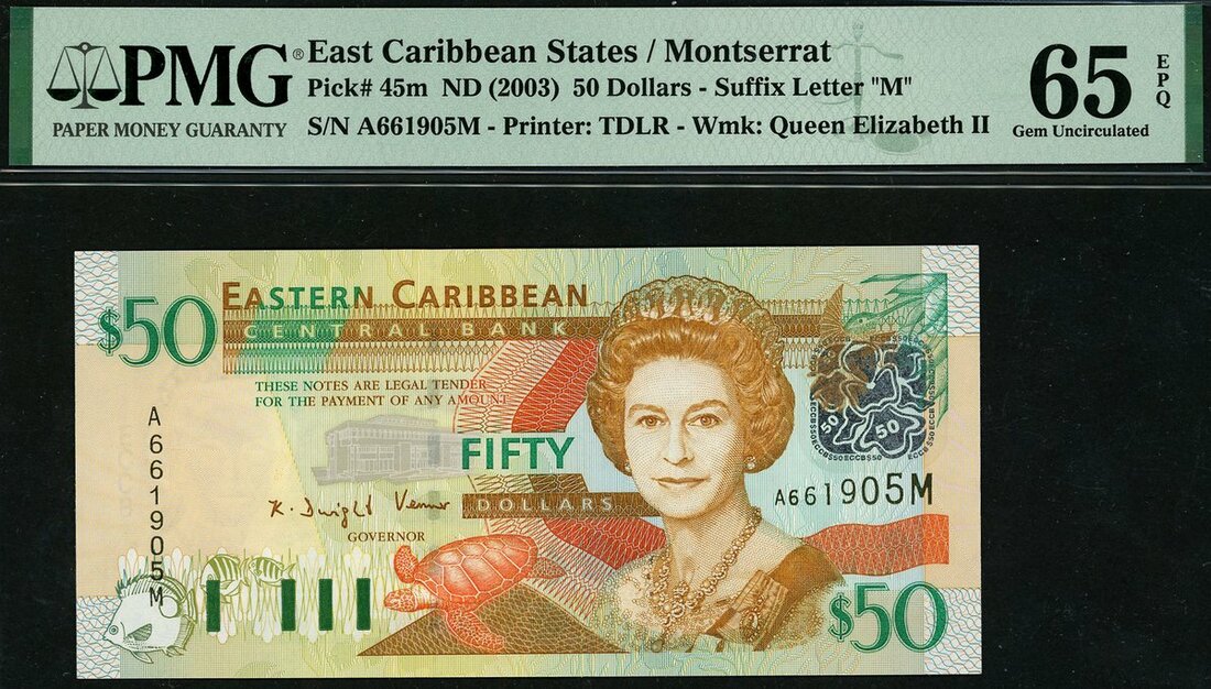 (x) Eastern Caribbean Central Bank, $50, Montserrat, ND (2003), serial number A661905M, (Pick 45m, TBB B229m), in PMG holder 65 EPQ Gem Uncirculated