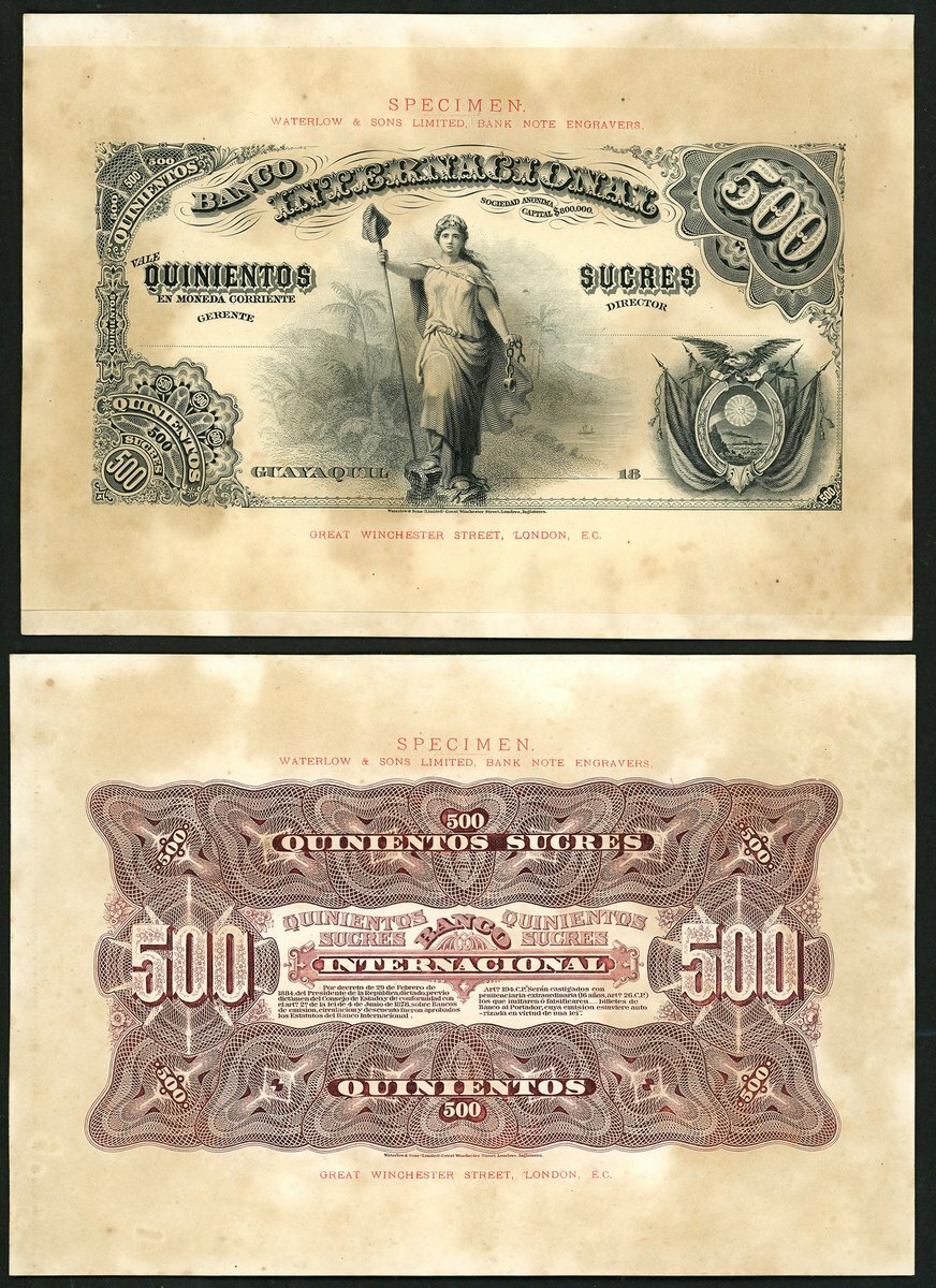 (x) Banco Internacional, Ecuador, an obverse and reverse proof on card for a 500 sucres, 18- (1886-1894), black and white, Liberty at centre, arms low right, reverse mauve and white, text at centre, value at left and right