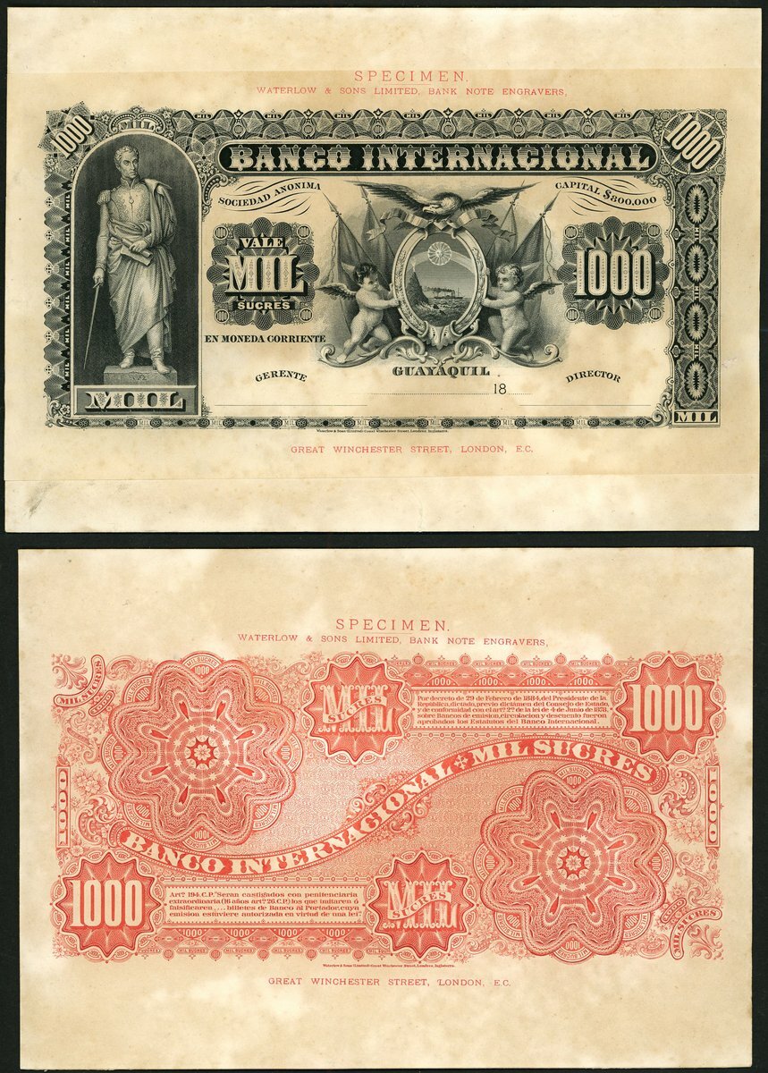 (x) Banco Internacional, Ecuador, an obverse and reverse proof on card for a 1000 sucres, 18- (1886-1894), black and white, Simon Bolivar at left, arms right centre, reverse red and white, text at centre, value at left and right