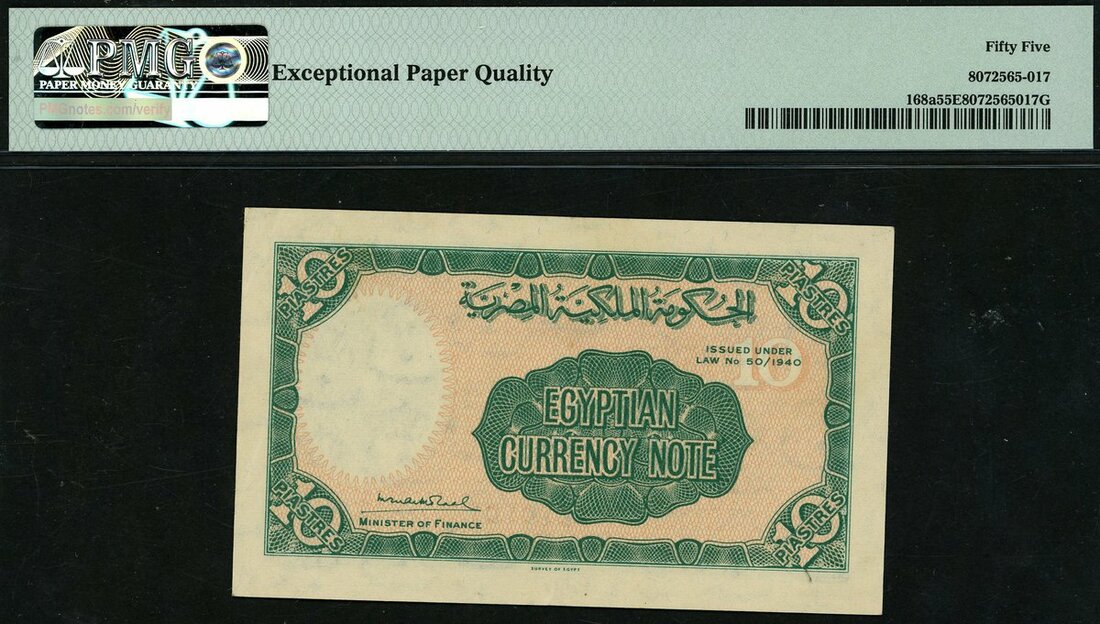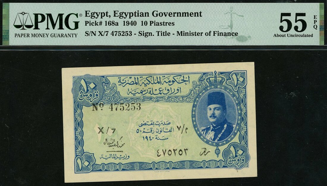 Egyptian Currency Note, 10 piastres, 1940, serial number X/7 475253, (Pick 168a, Hanafy, TBB B213n), in PMG holder 55 EPQ Choice About Uncirculated