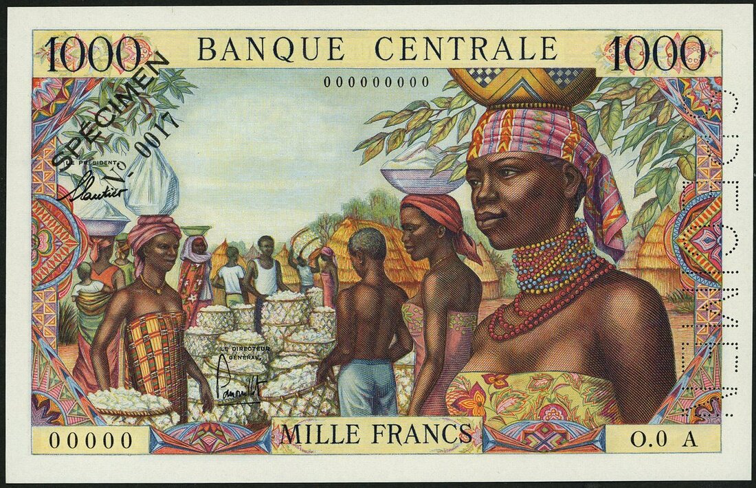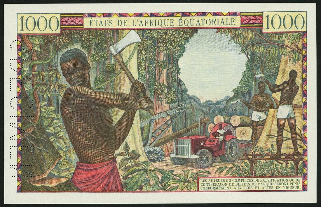Banque Centrale, États de l'Afrique Équatoriale, Equatorial African States, specimen 1000 francs, ND (1963), serial number O.0.A 00000, Chad, red-brown and pale yellow, market, 'marche cotonier' at centre, signatures of Gautier and Panouillot, reverse multicoloured, tree felling and tractor, black SPECIMEN No. 0017 in field