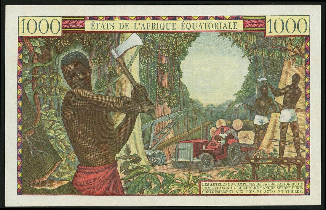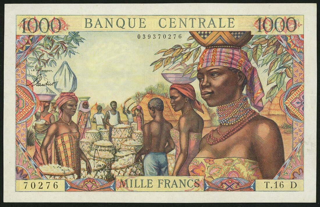 Banque Centrale, Etats de l'Afrique Equatoriale, 1000 francs. Gabon, ND (1966), serial number T.16D 70276, multicoloured, local men and women at a market with local produce, signatures of Panouillot and Gautier, reverse green and multicoloured, logging scene