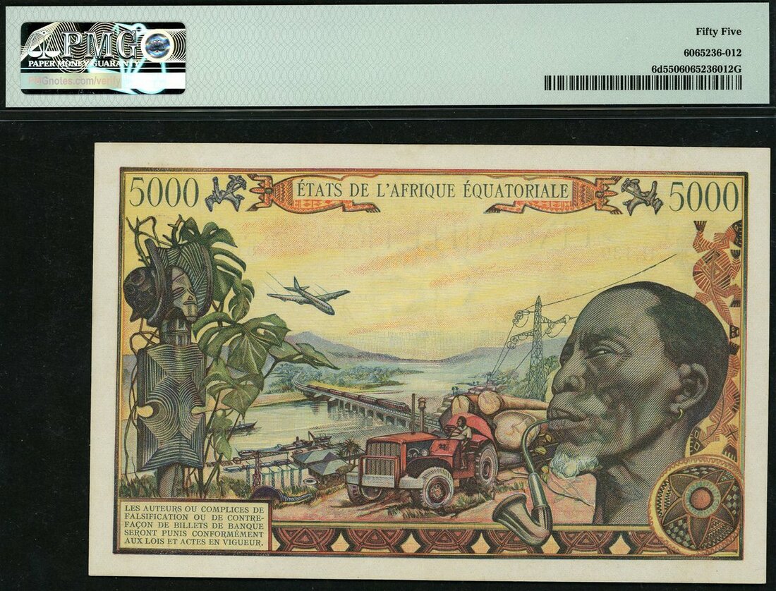 (x) Equatorial African States/Gabon, 5000 francs, ND(1963), serial number H.139 607, (Pick 6d), in PMG holder 55 About Uncirculated, superb grade for type, and very difficult to find anything in echelons of about uncirculated, 4th highest grade on PMG Census, scarce