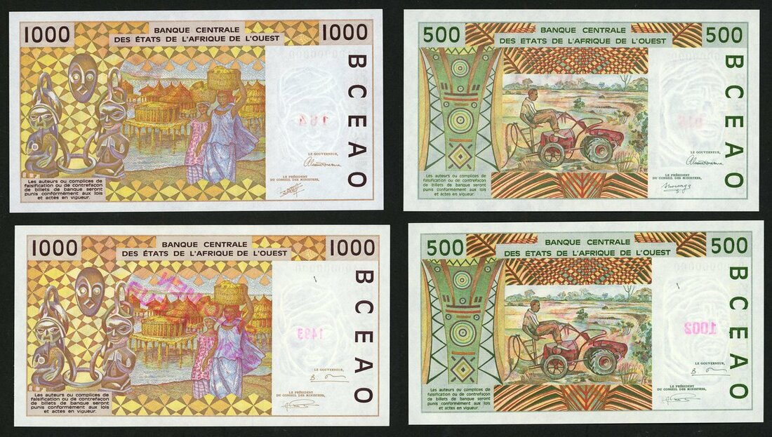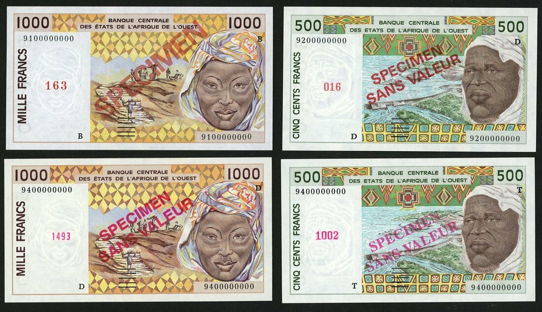 (x) Banque Centrale des Etats de l'Afrique de l'Ouest, specimen 500 francs (2), one D (Mali) and one T (Togo), ND (ca 1991), green and multicoloured, also specimen 1000 francs (2), ND (1991), B (Benin) and D (Mali), brown and multicoloured