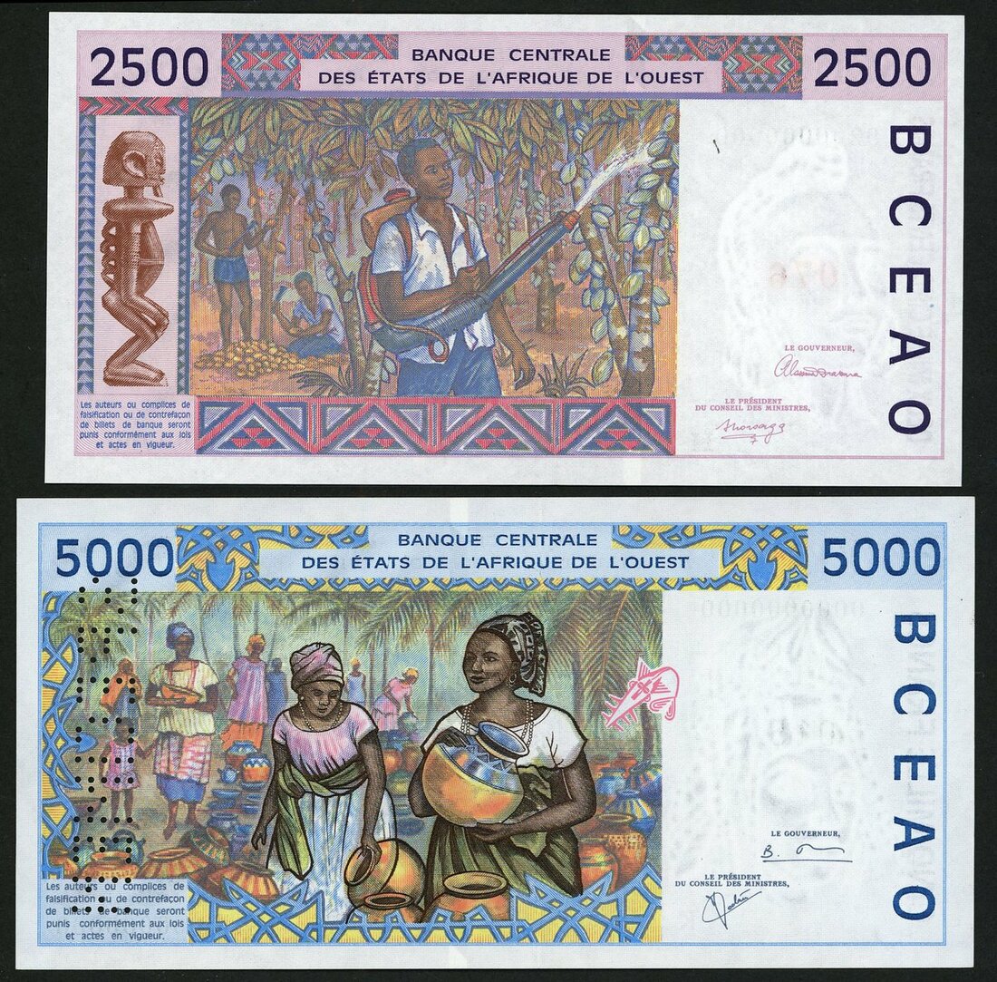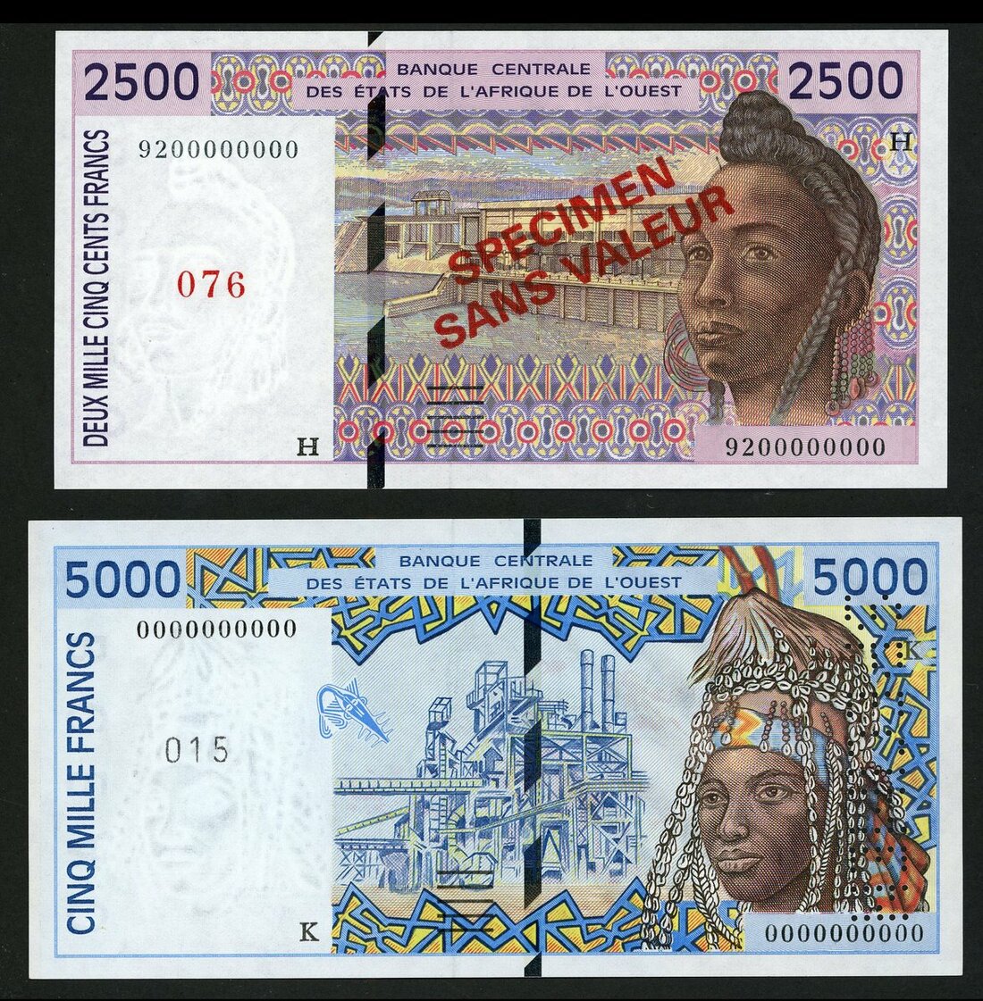 (x) Banque Centrale des Etats de l'Afrique de l'Ouest, specimen 2500 francs, H (Niger), ND (ca 1992-), blue and multicoloured, also specimen 5000 francs, ND (1992-), K (Senegal), blue