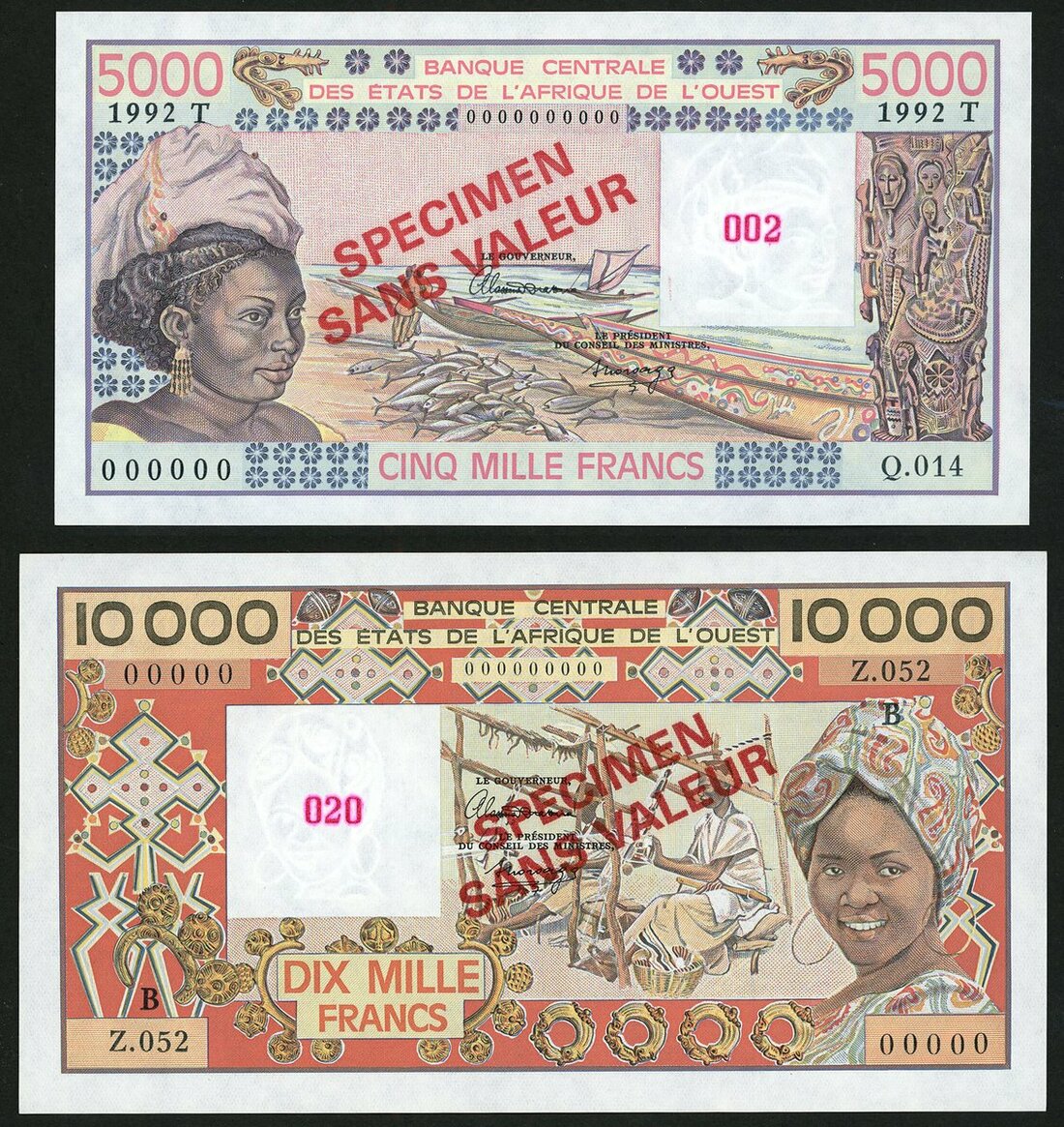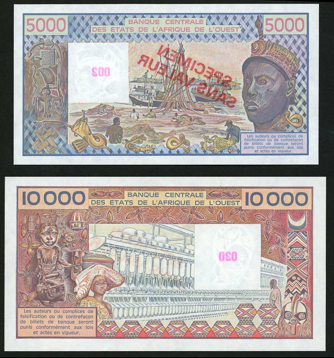 (x) Banque Centrale des Etats de l'Afrique de l'Ouest, specimen 5000 francs, T (Togo), ND (ca 1977-), blue and multicoloured, also specimen 10000 francs, ND (1977-), B (Benin), red and multicoloured