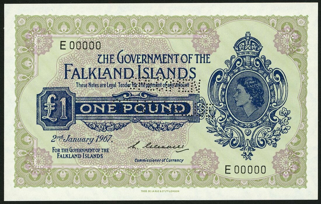 Government of The Falkland Islands, specimen £1, 2 January 1967, serial number E 00000, green and lilac, Elizabeth II at right