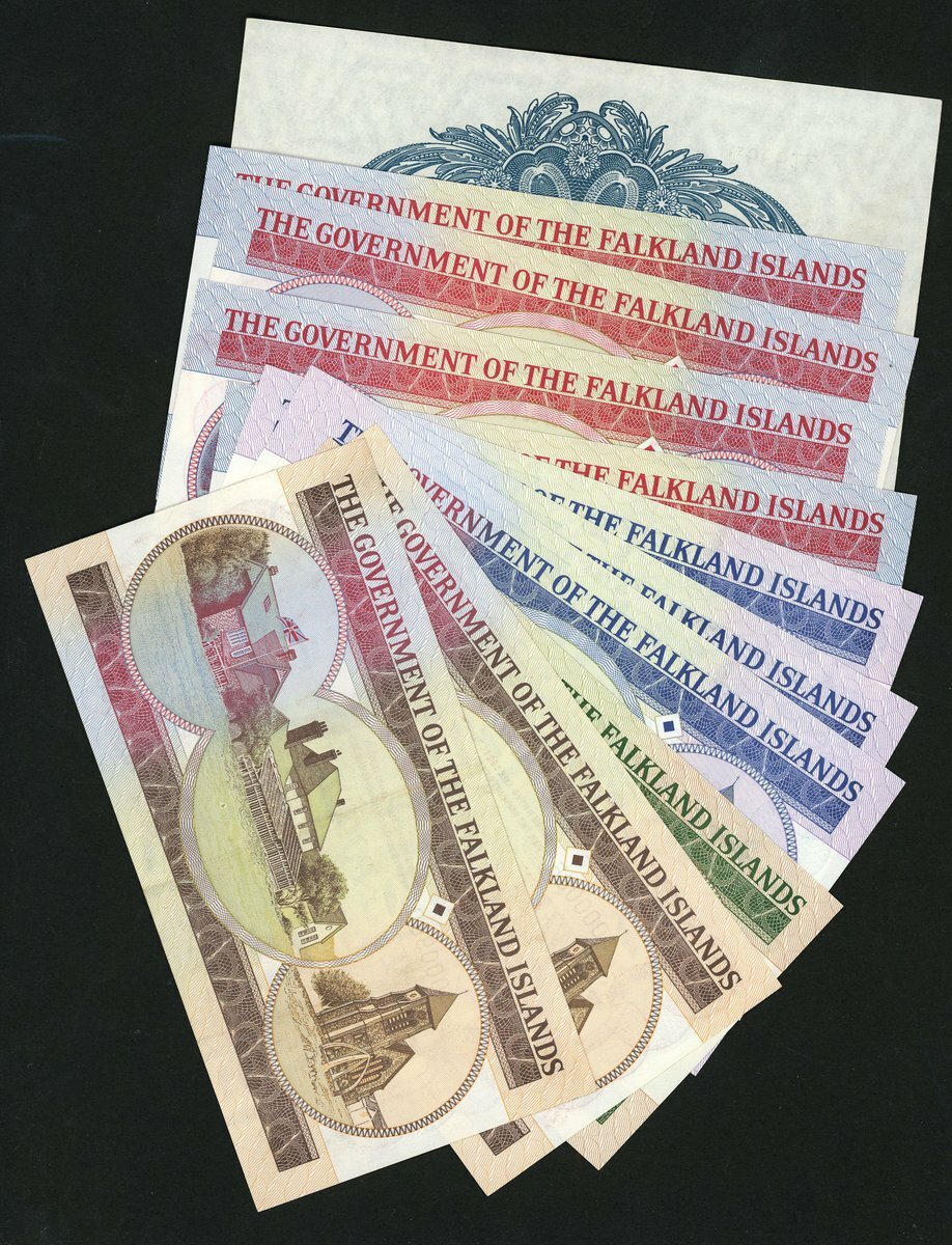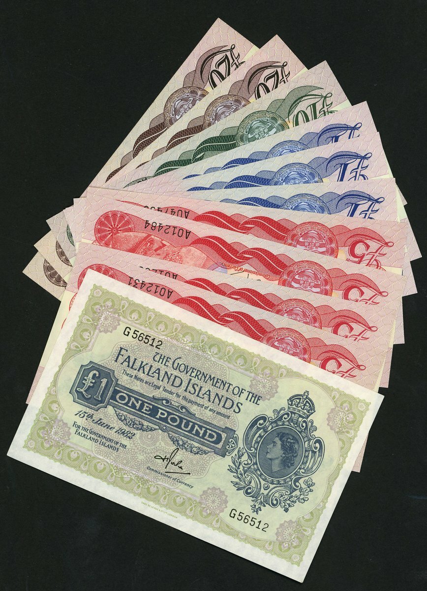 Government of The Falkland Islands, including £1 1982, £5 (4) 1983, £1 (3) 1984, £10 1986, £20 (2) 1984, serial numbers A 000095 and A000960,