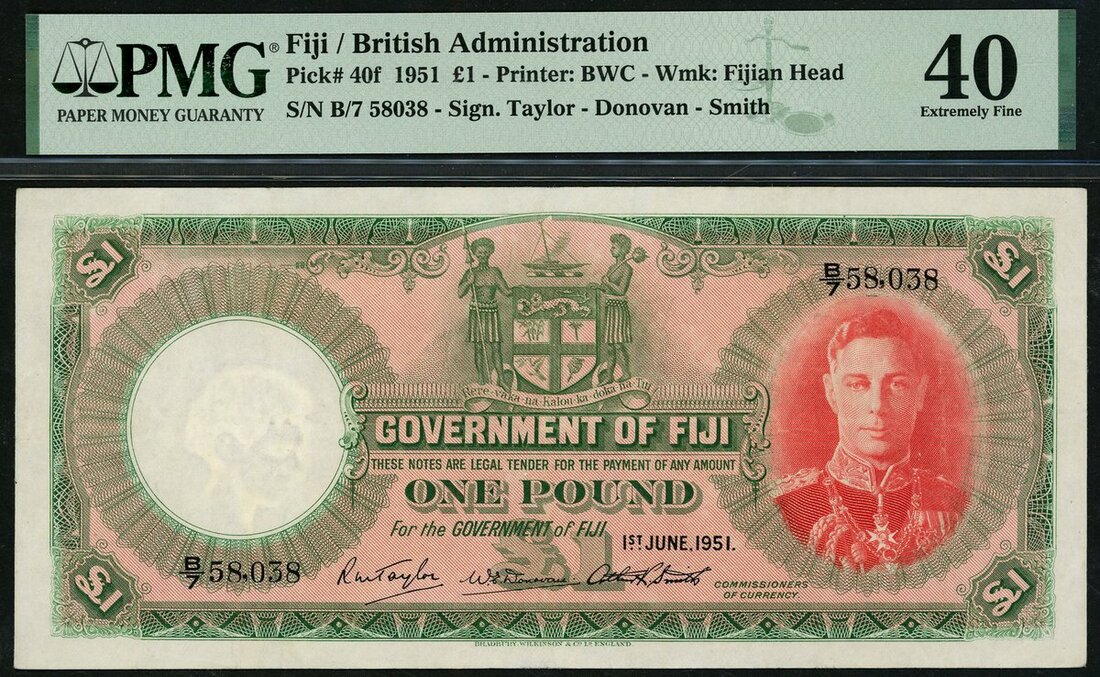 (x) Government of Fiji, £1, 1 June 1951, serial number B/7 58,038, (Pick 40f, TBB B316f), last date, in PMG holder 40 Extremely Fine