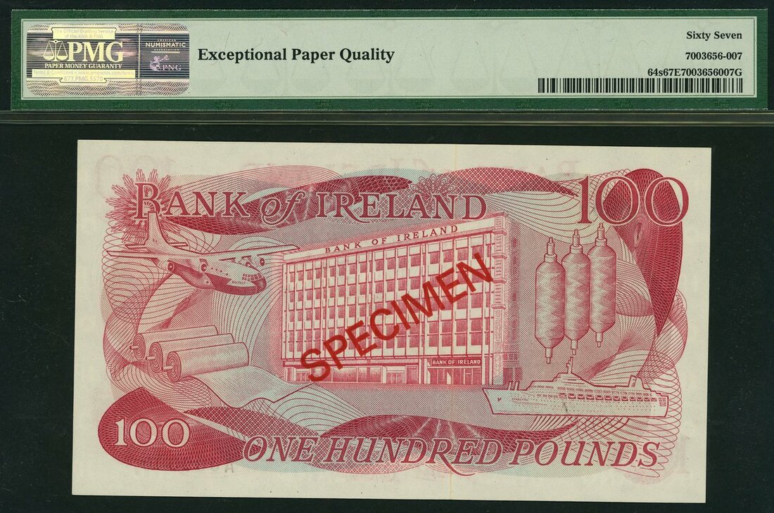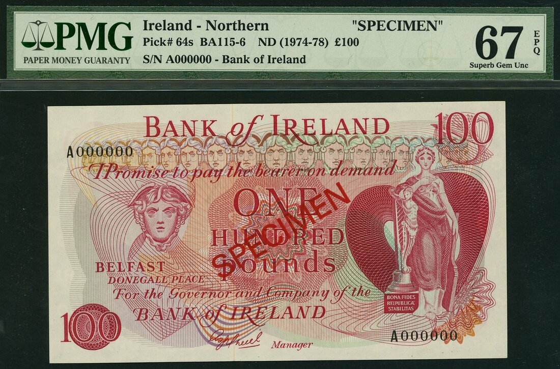 Bank of Ireland, specimen £100, ND (1974-78), (Pick 64s, BA 115-6), PMG Top Pop, 67 EPQ Superb Gem Uncirculated